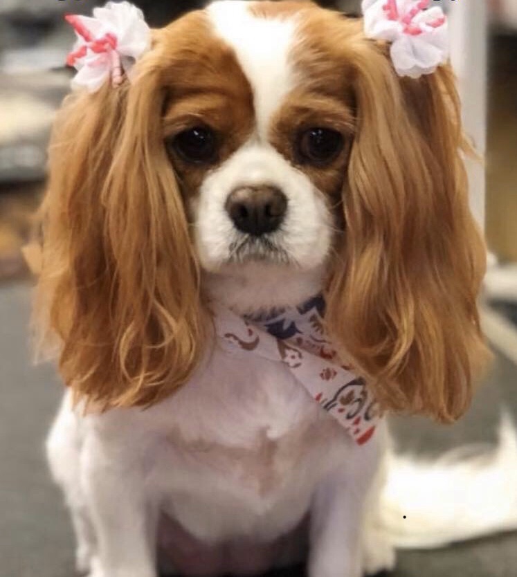 Painting of a Cavalier King Charles Spaniel wearing pink hair bows and a bandana.