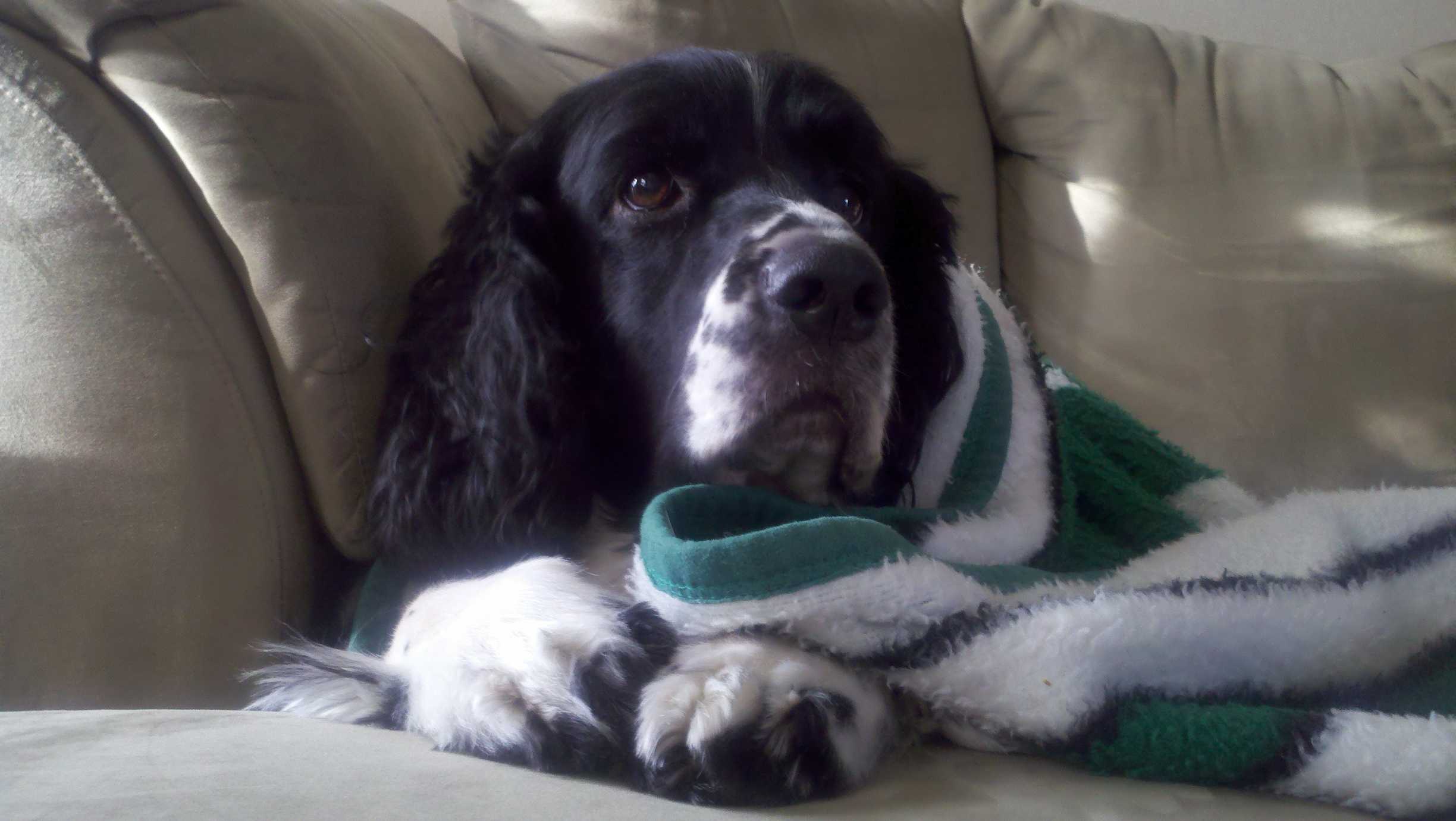 Painting of a black and white Springer Spaniel wrapped in a green and white blanket.