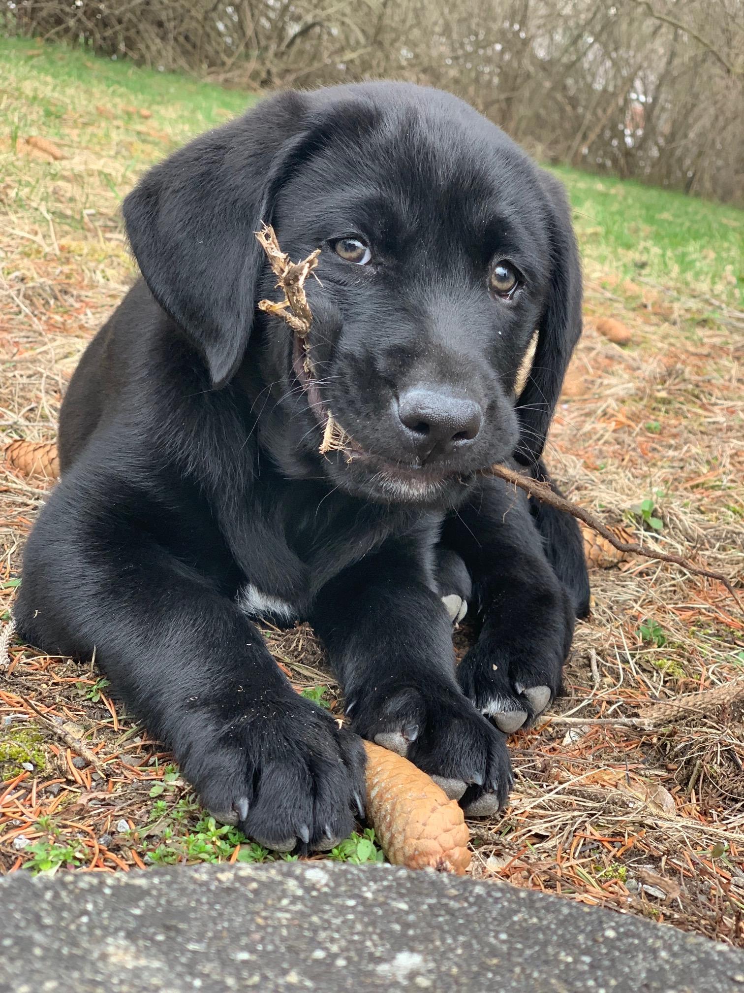 Painting of a black Labrador puppy holding a stick and a treat.