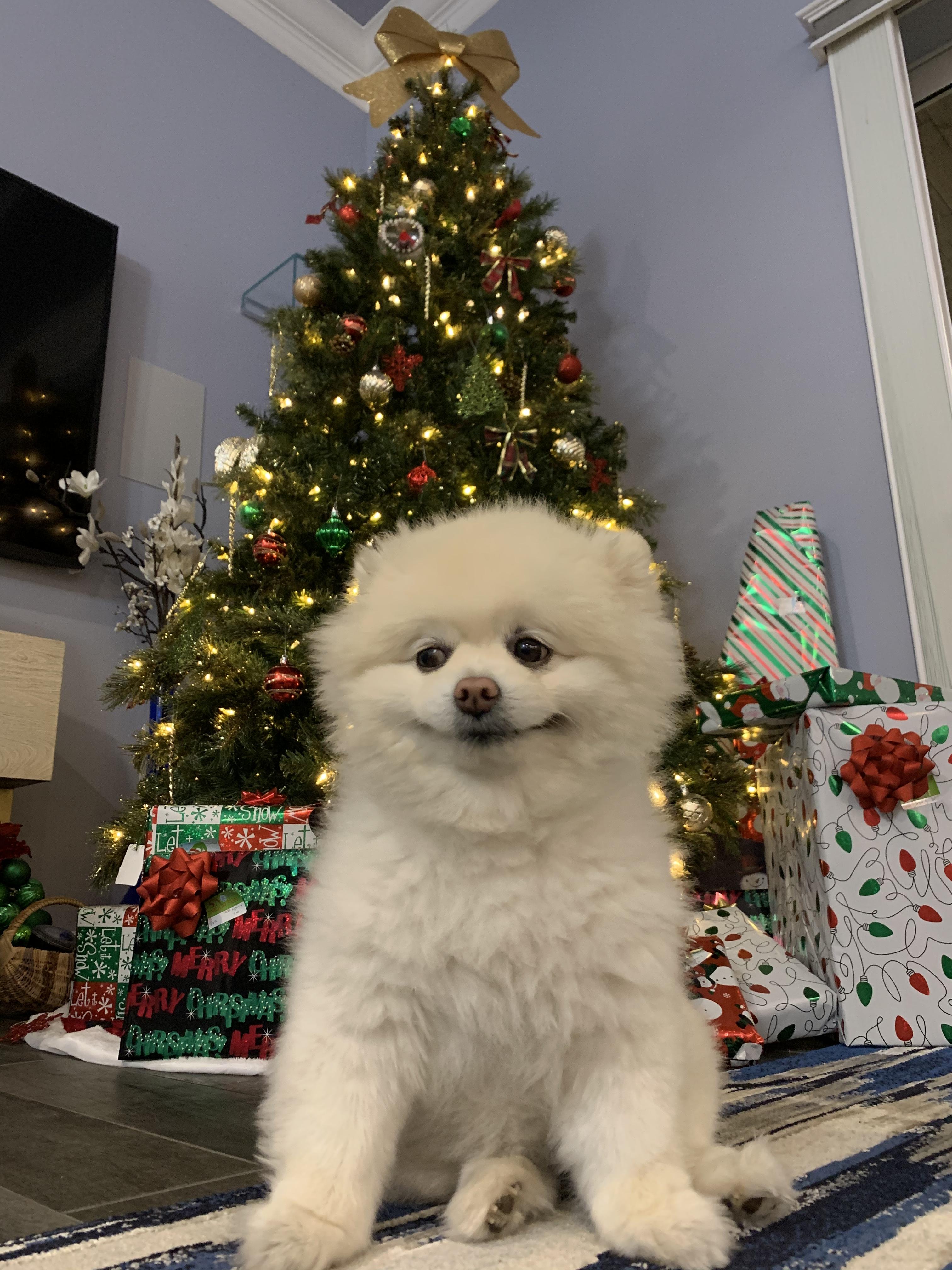 Painting of a white Pomeranian dog sitting by a Christmas tree and presents.