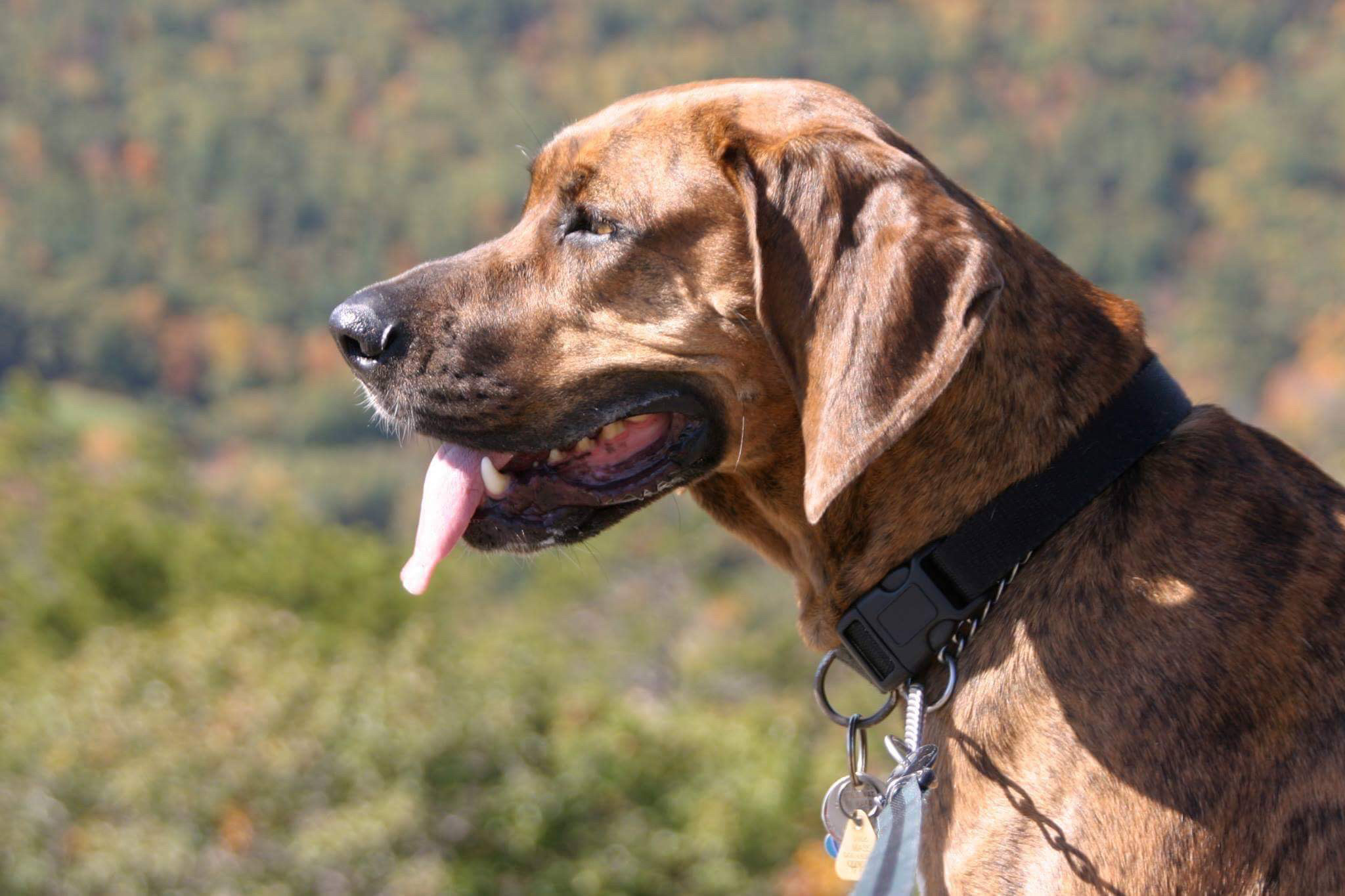 Painting of a brown dog with its tongue out, wearing a collar and ID tag.