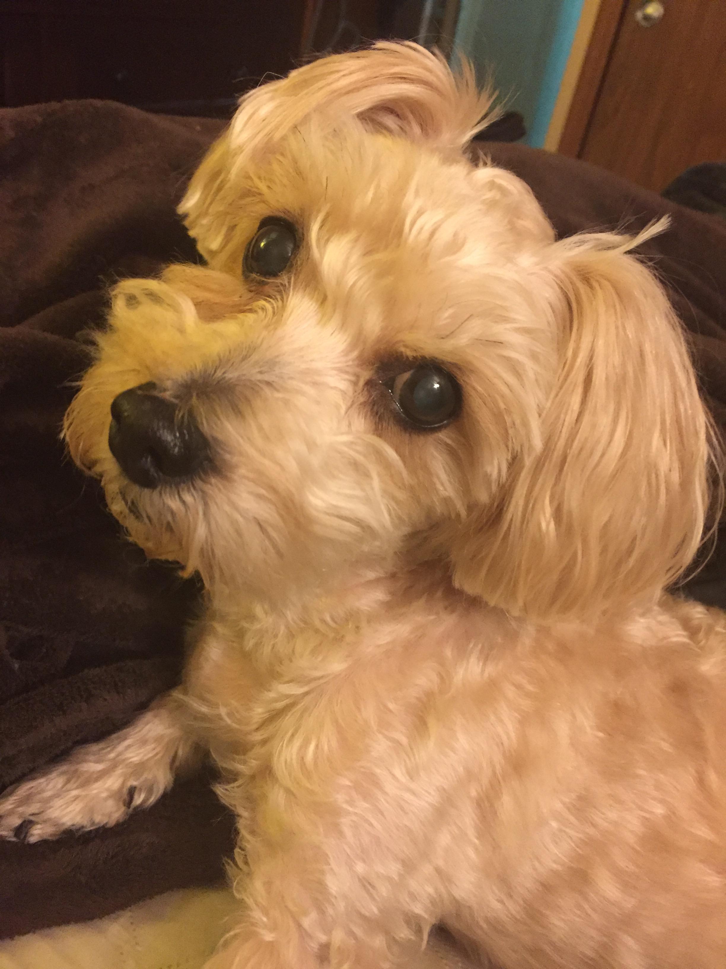 Painting of a light tan dog looking over its shoulder
