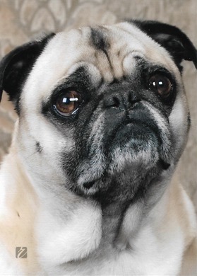 Painting of a fawn pug lying on a couch.