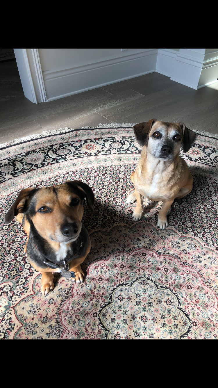 Painting of two dogs sitting in grass.