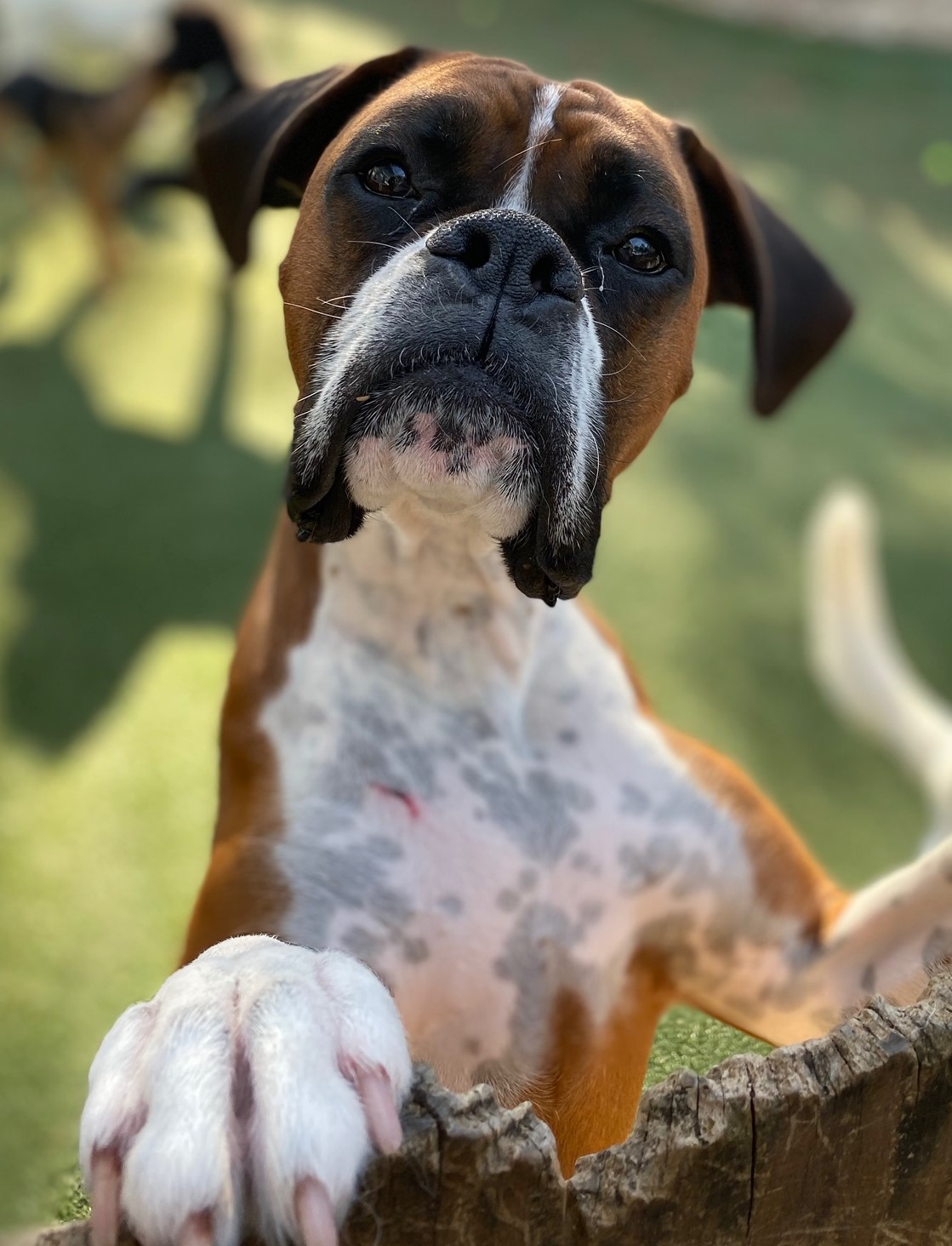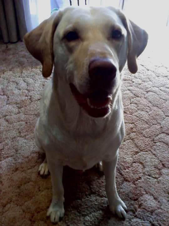 Painting of a yellow Labrador Retriever sitting on a dock near water.