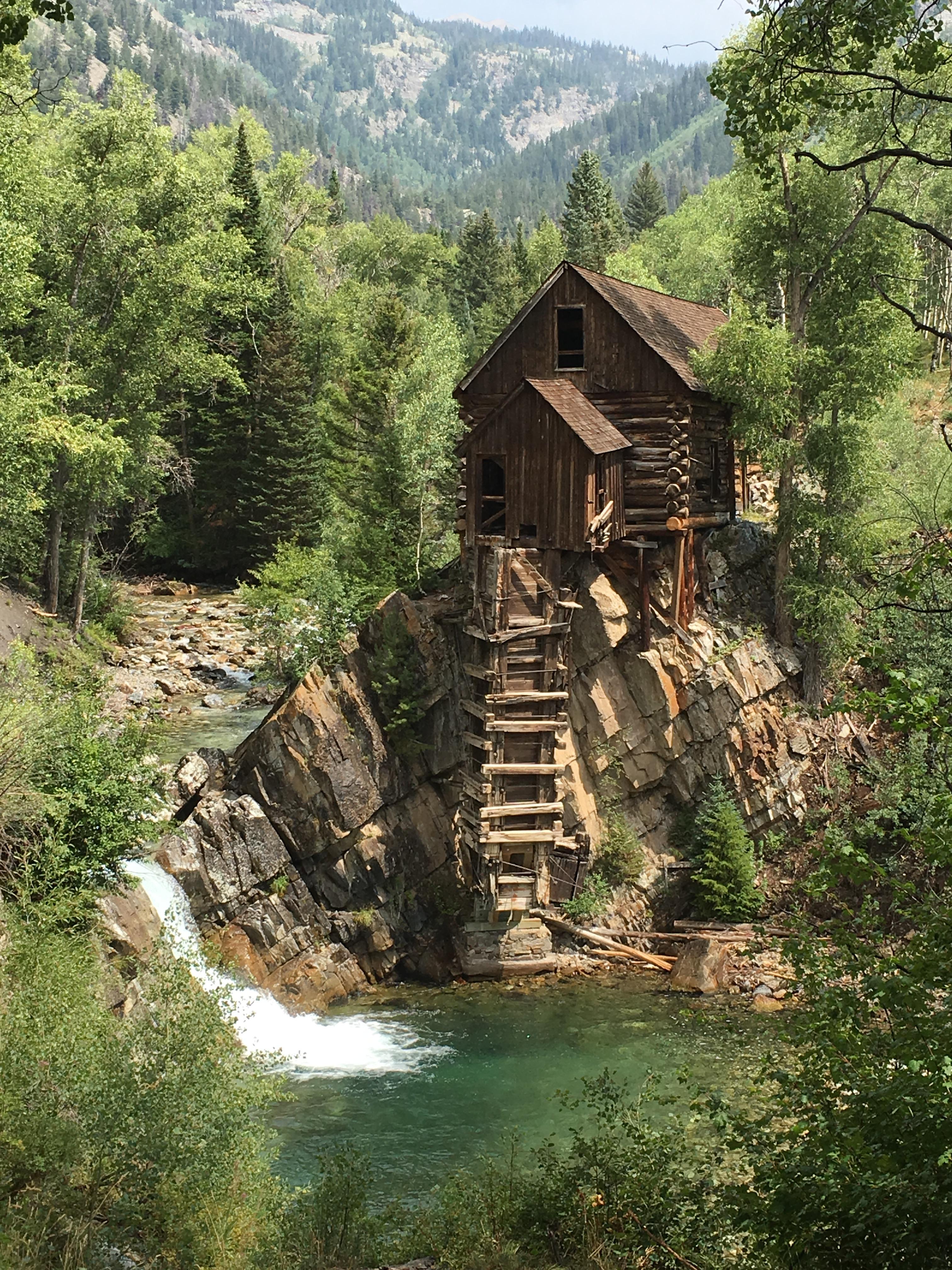 Painting of a wooden mill on a rocky cliff beside a waterfall and stream in a lush green forest.