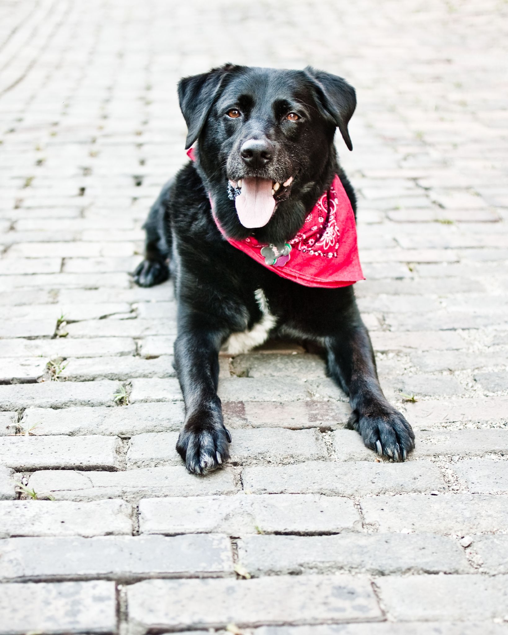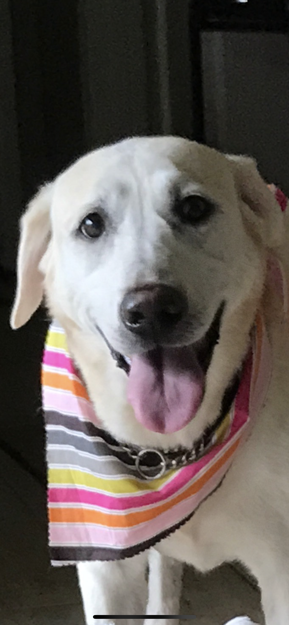 Painting of a yellow Labrador Retriever wearing a bandana and collar.