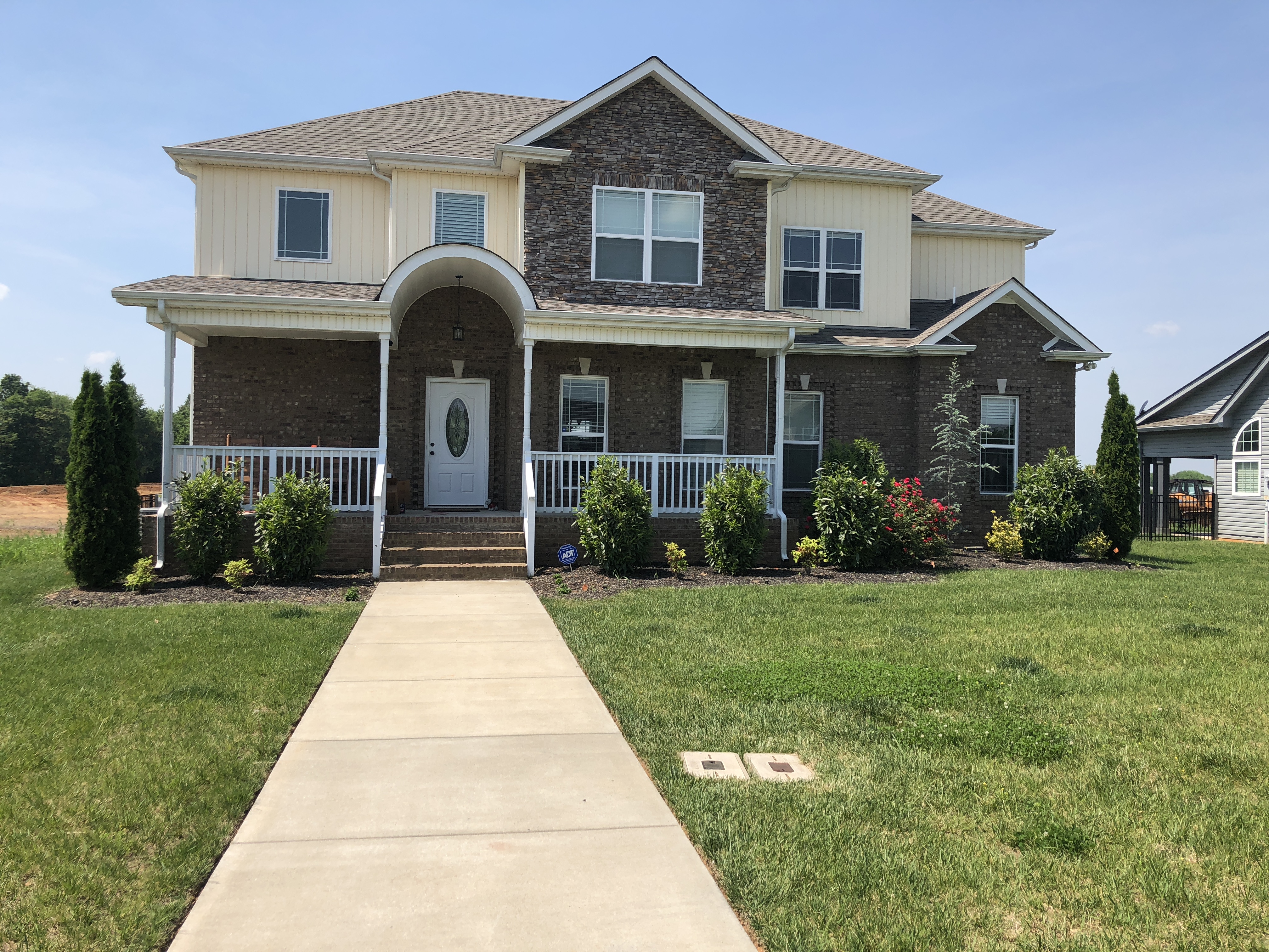 Painting of a two-story house with brown brick and yellow siding, a white porch, and landscaping.