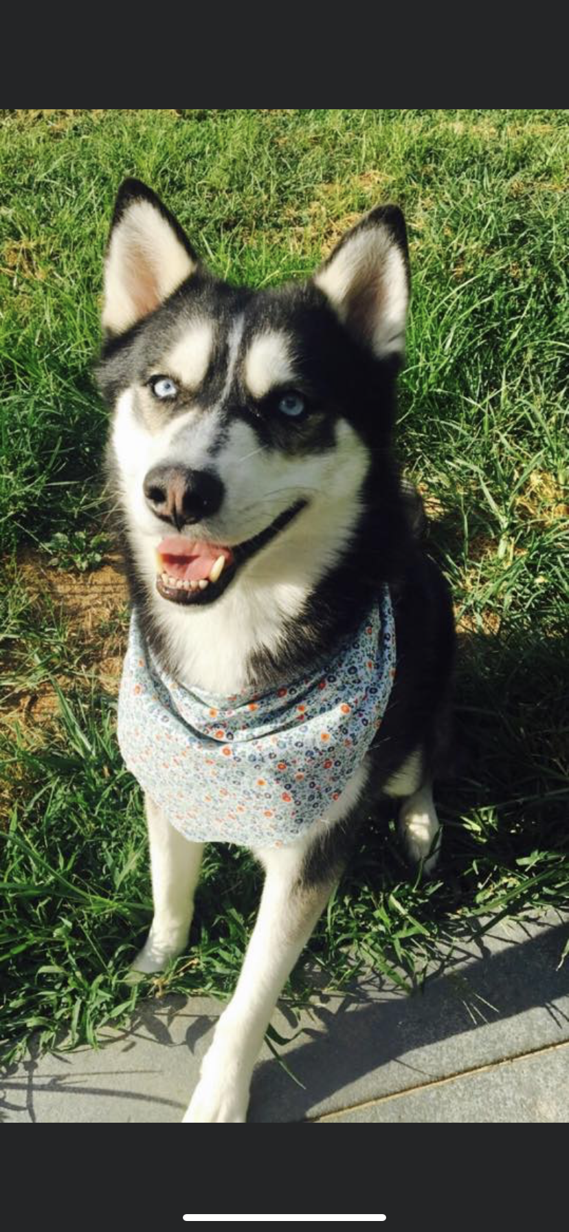 Colored pencil drawing of a smiling husky wearing a bandana.