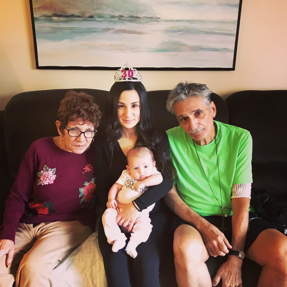 Family portrait painting of parents with three children, a baby, a girl, and a boy.
