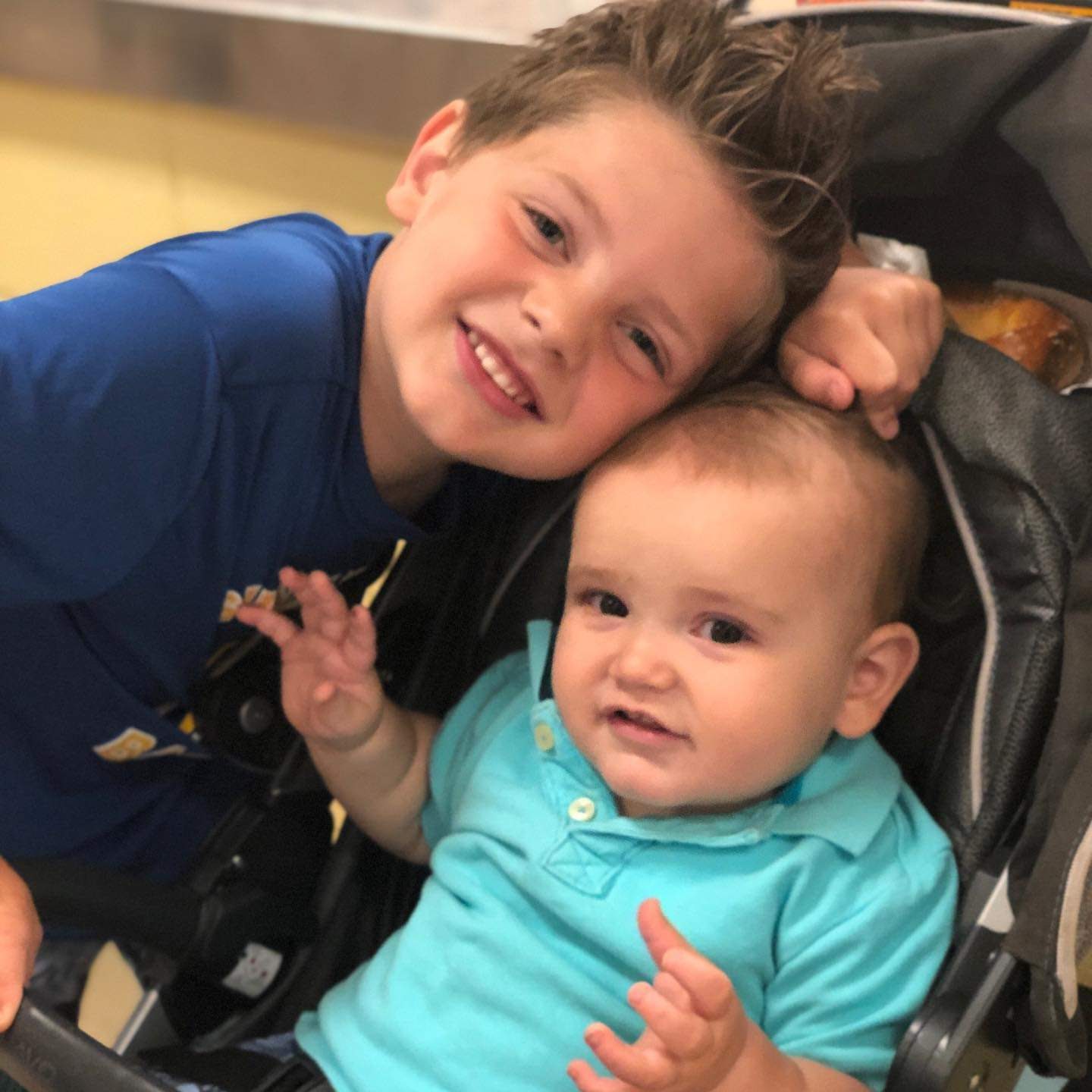 Painting of two brothers, an older boy with blue eyes smiling and a younger baby in a blue shirt.