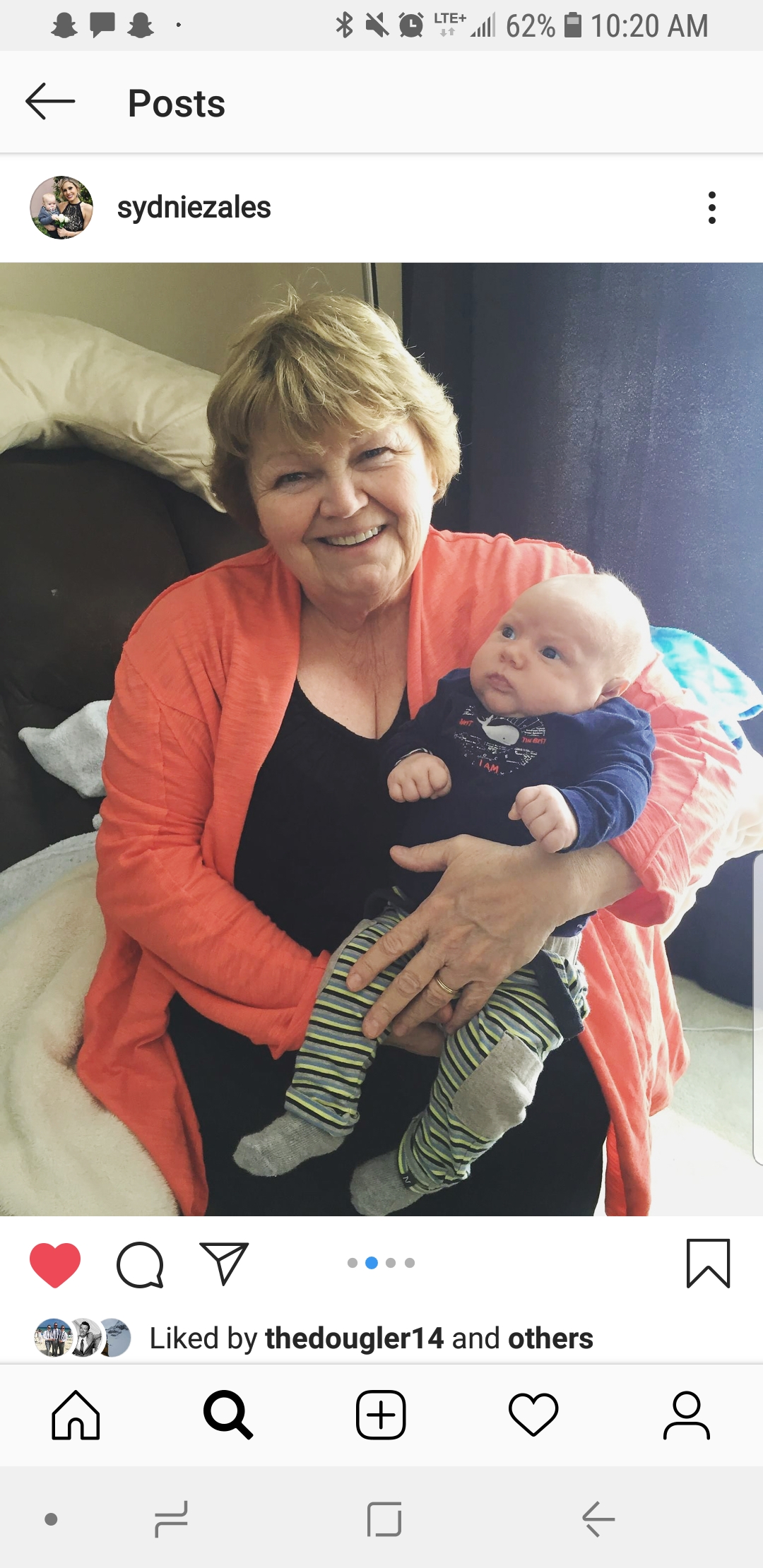 Oil portrait of a smiling elderly woman wearing glasses and a patterned shirt.