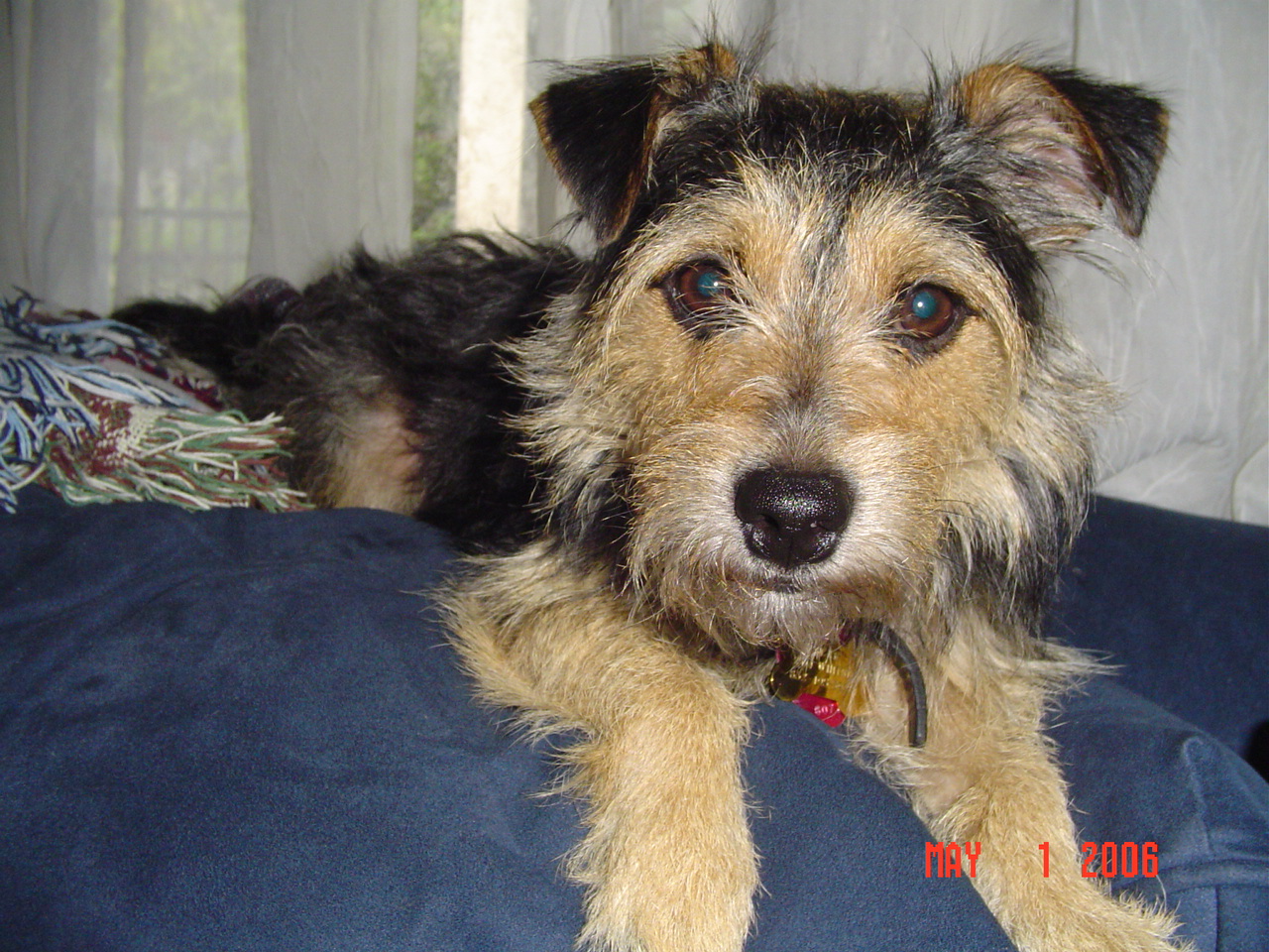 Painting of a small, long-haired dog lying down.