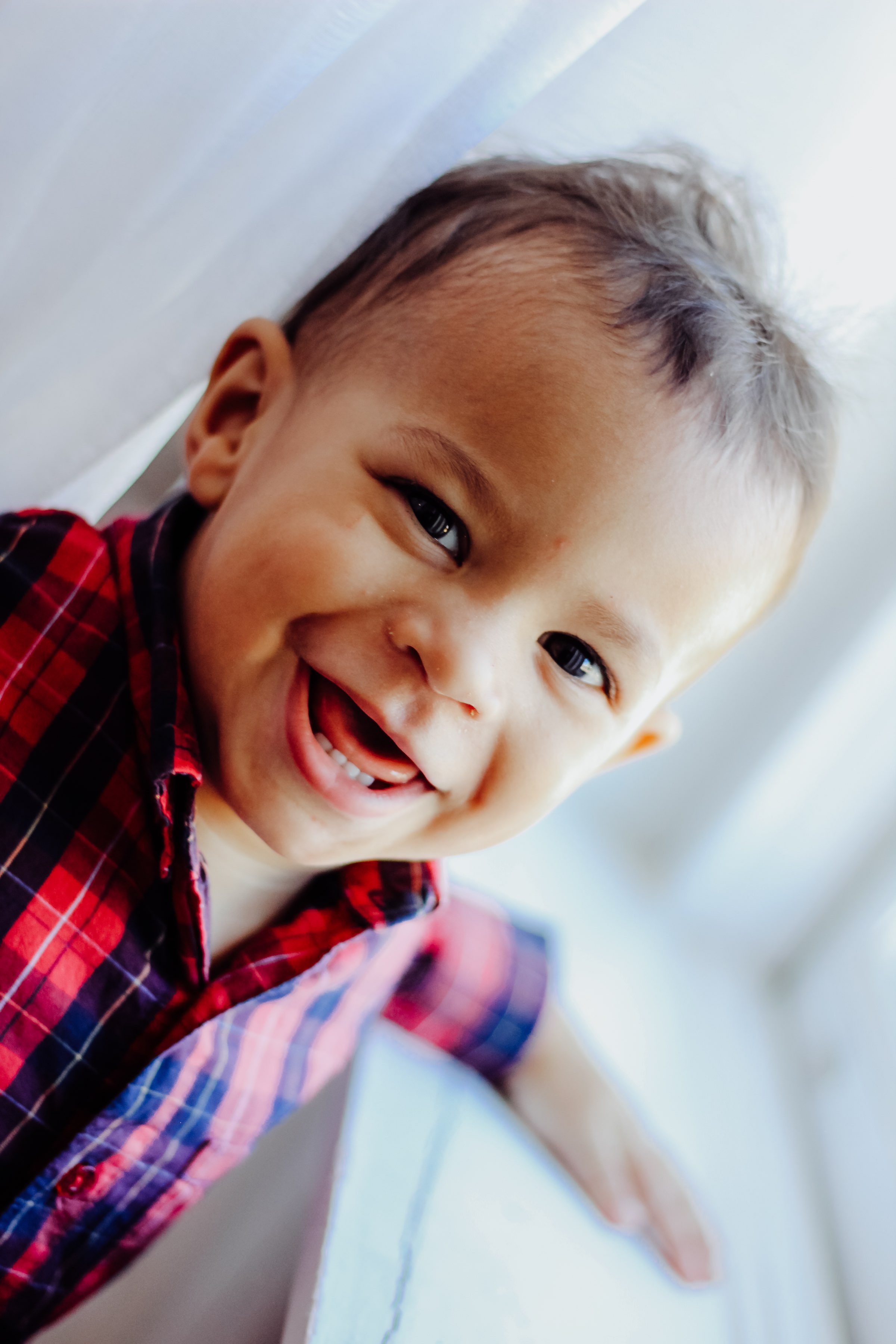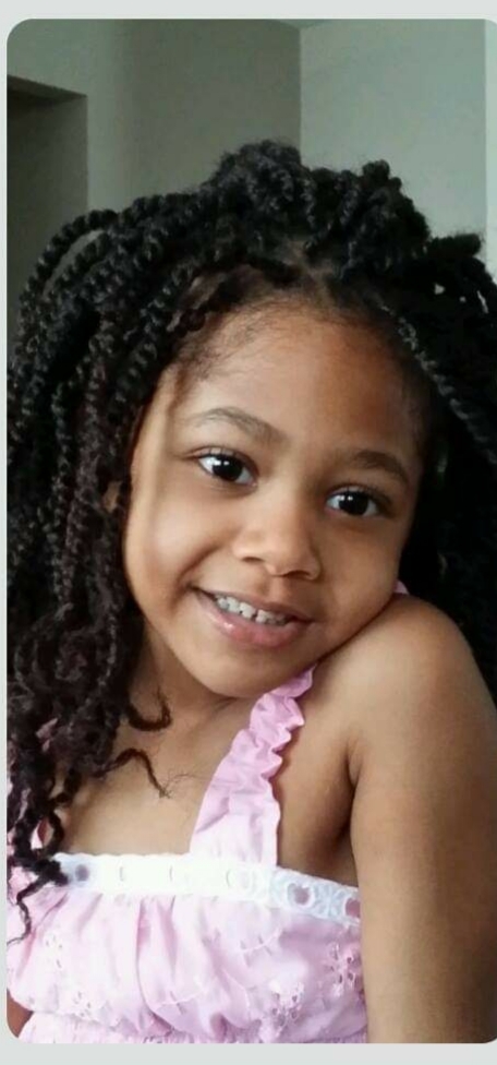 Portrait of a smiling young girl with long dark braids, wearing a pink top.