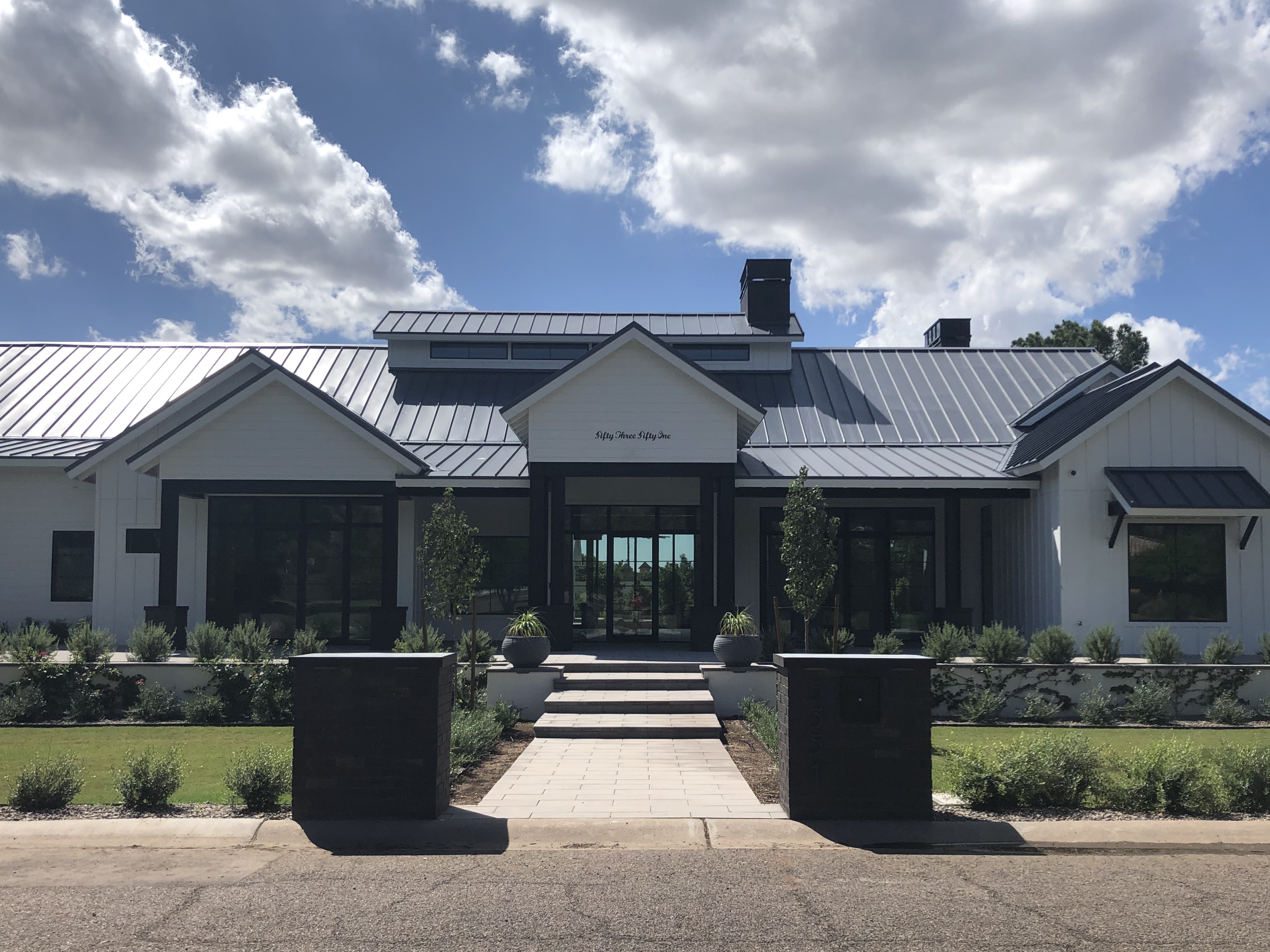 Painting of a modern farmhouse under a partly cloudy sky
