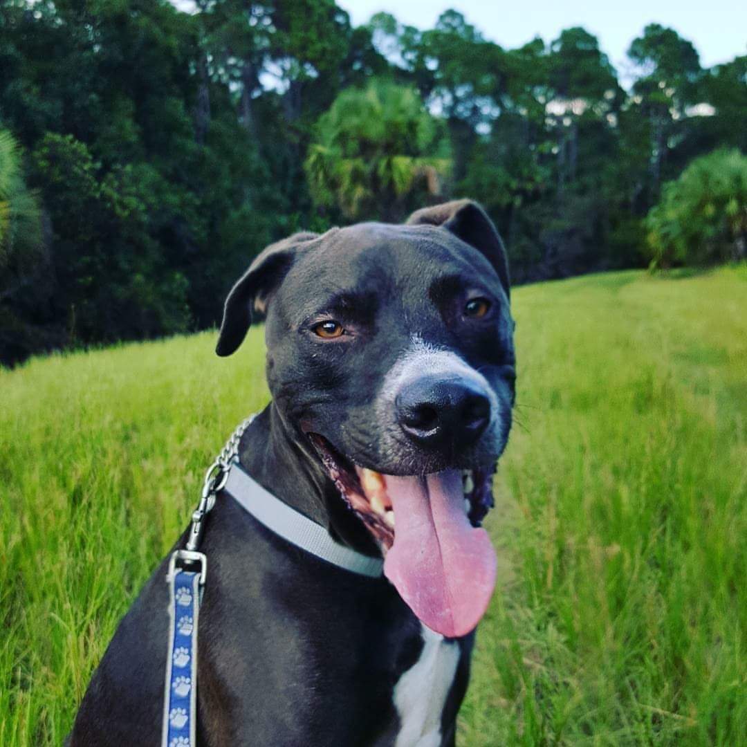 Painting of a black Pit Bull with its tongue out.