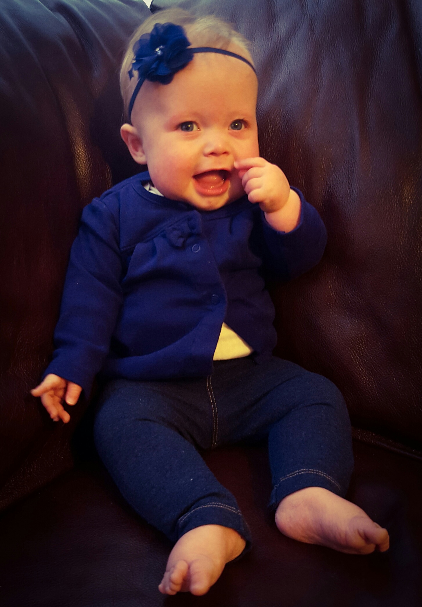 Painting of a smiling baby wearing blue clothes and a blue headband with a flower.