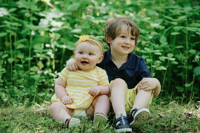 Painting of a toddler girl in a yellow dress and a young boy sitting together in a garden.