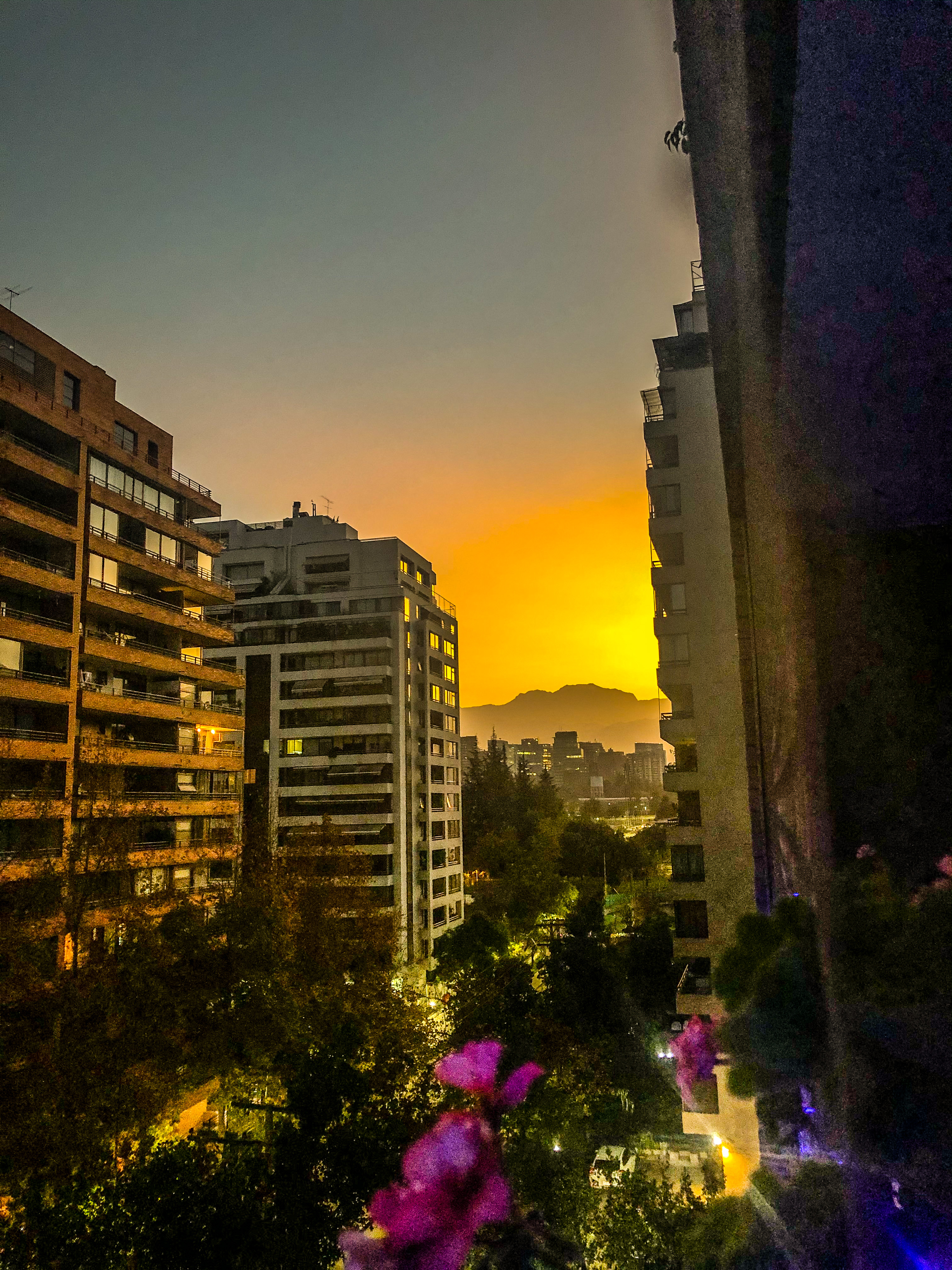Sunset view between apartment buildings, seen from a balcony with flowers in the foreground.