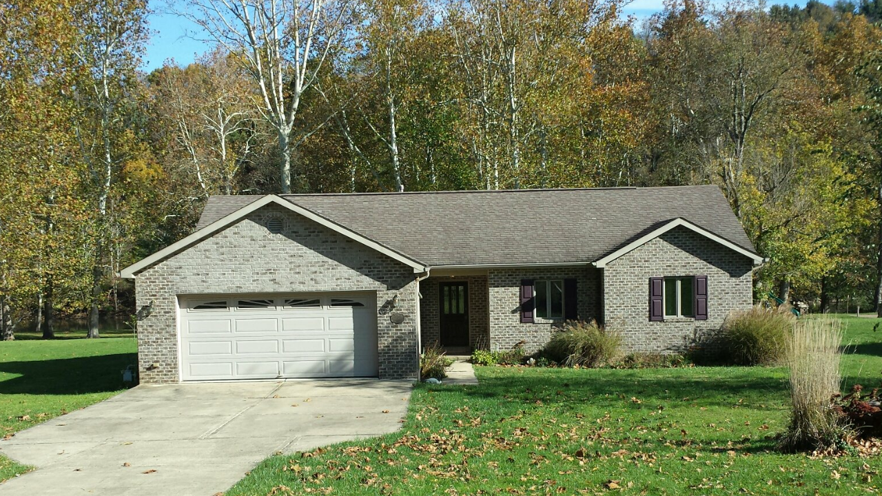Painting of a ranch house with a stone facade, white garage door, and green lawn, set against an autumnal forest backdrop.