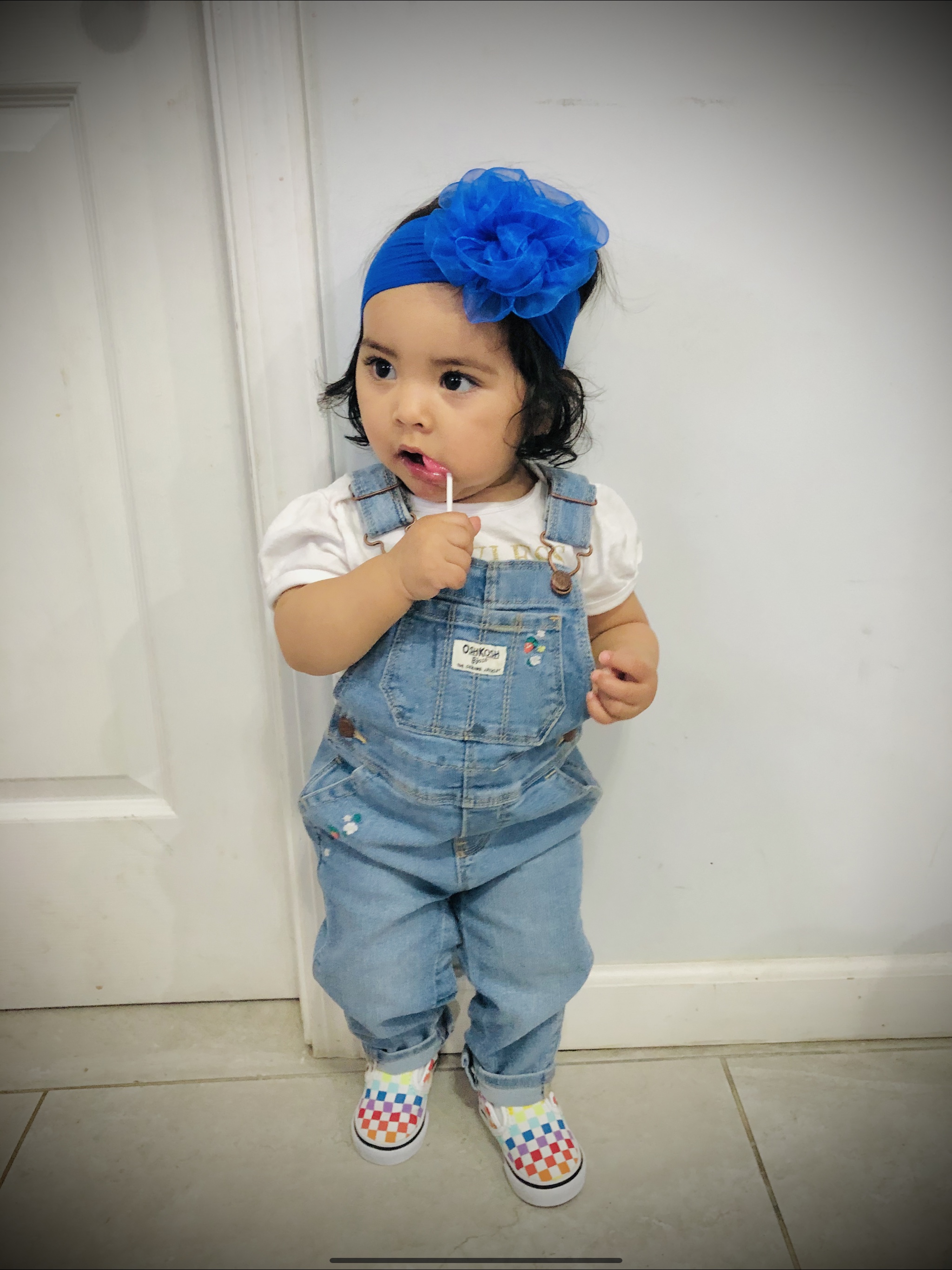 Painting of a woman holding a toddler, ocean and pier in the background.