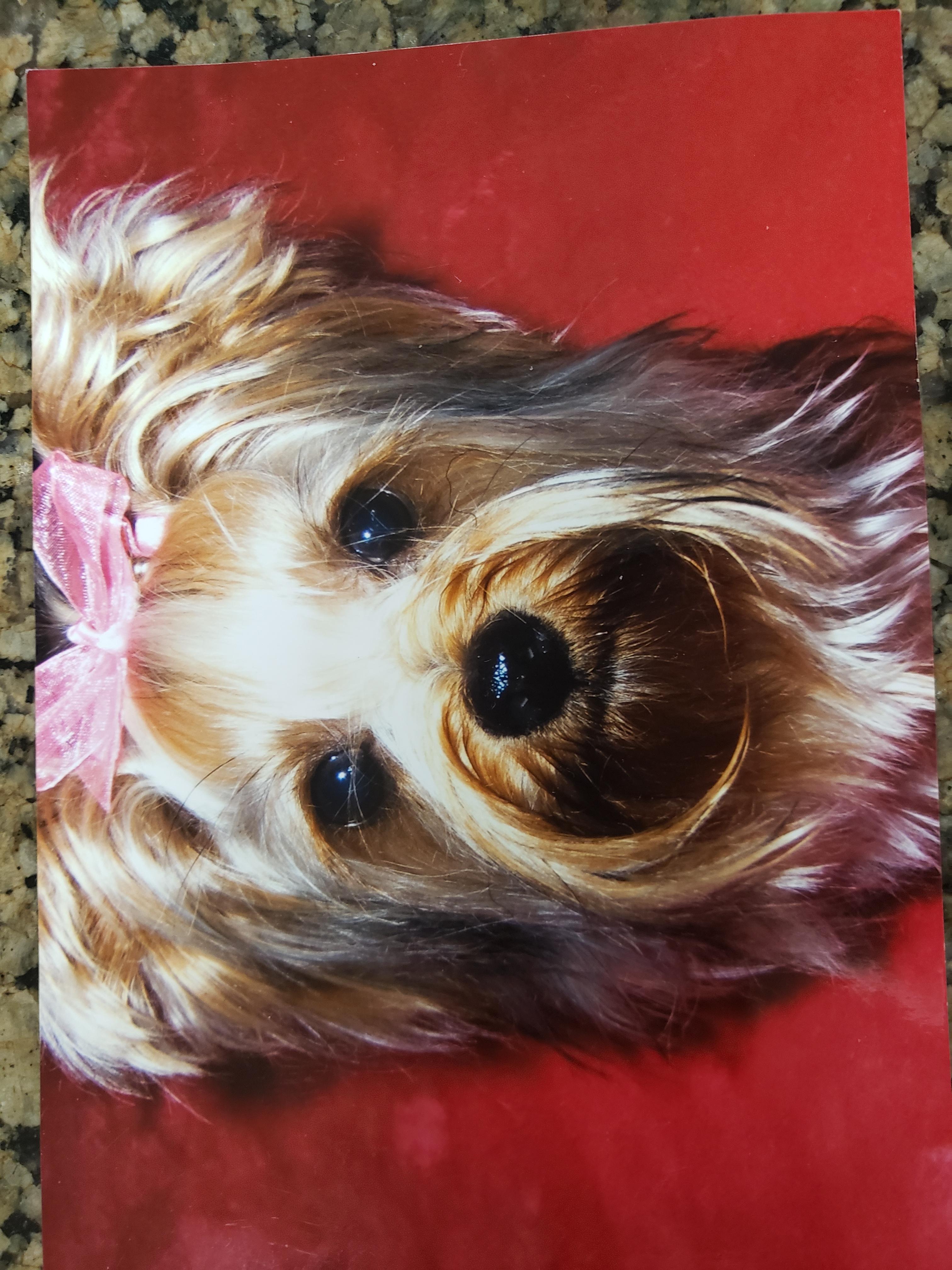 Painting of five small dogs, one appears to be a Shih Tzu, the others Yorkshire Terriers.