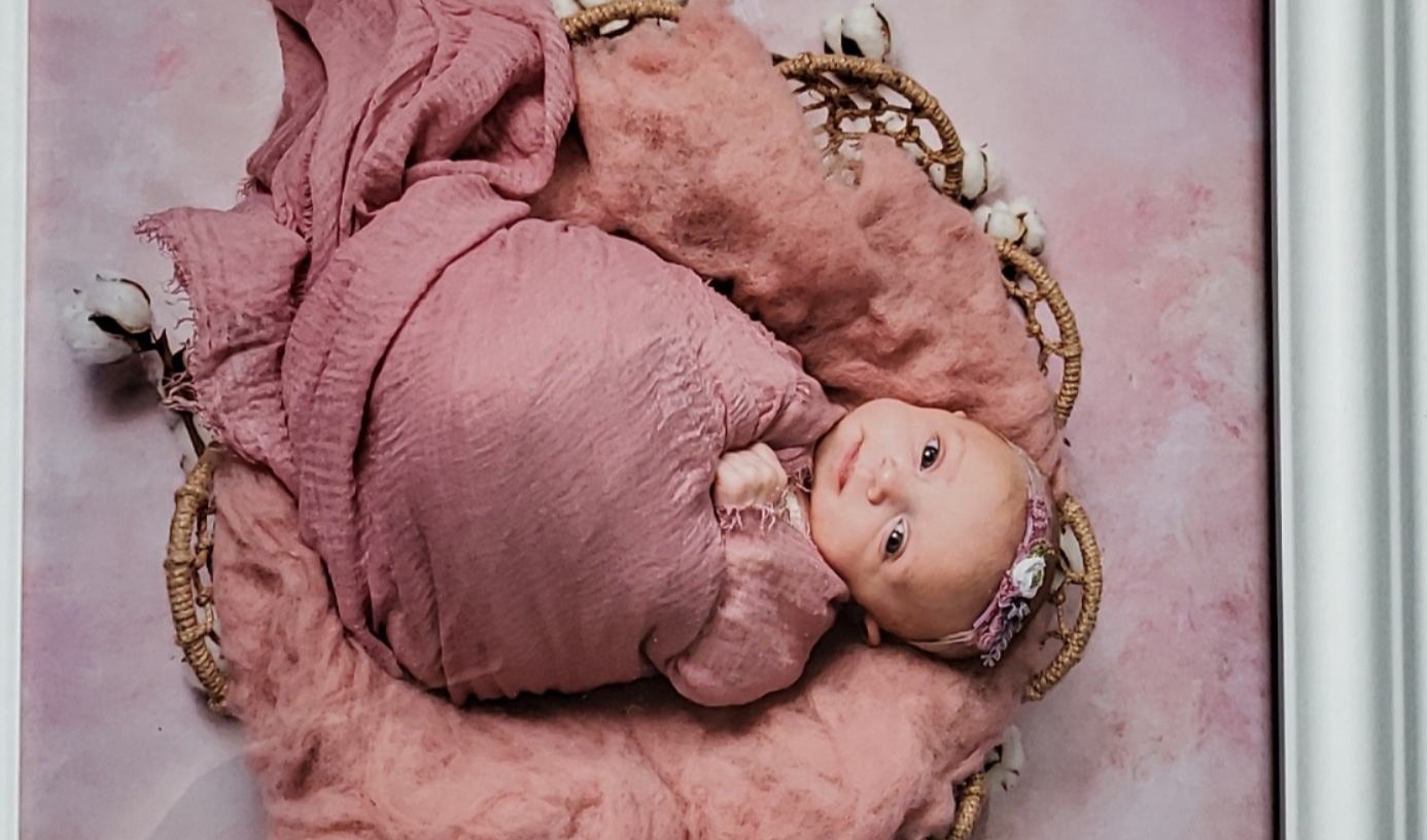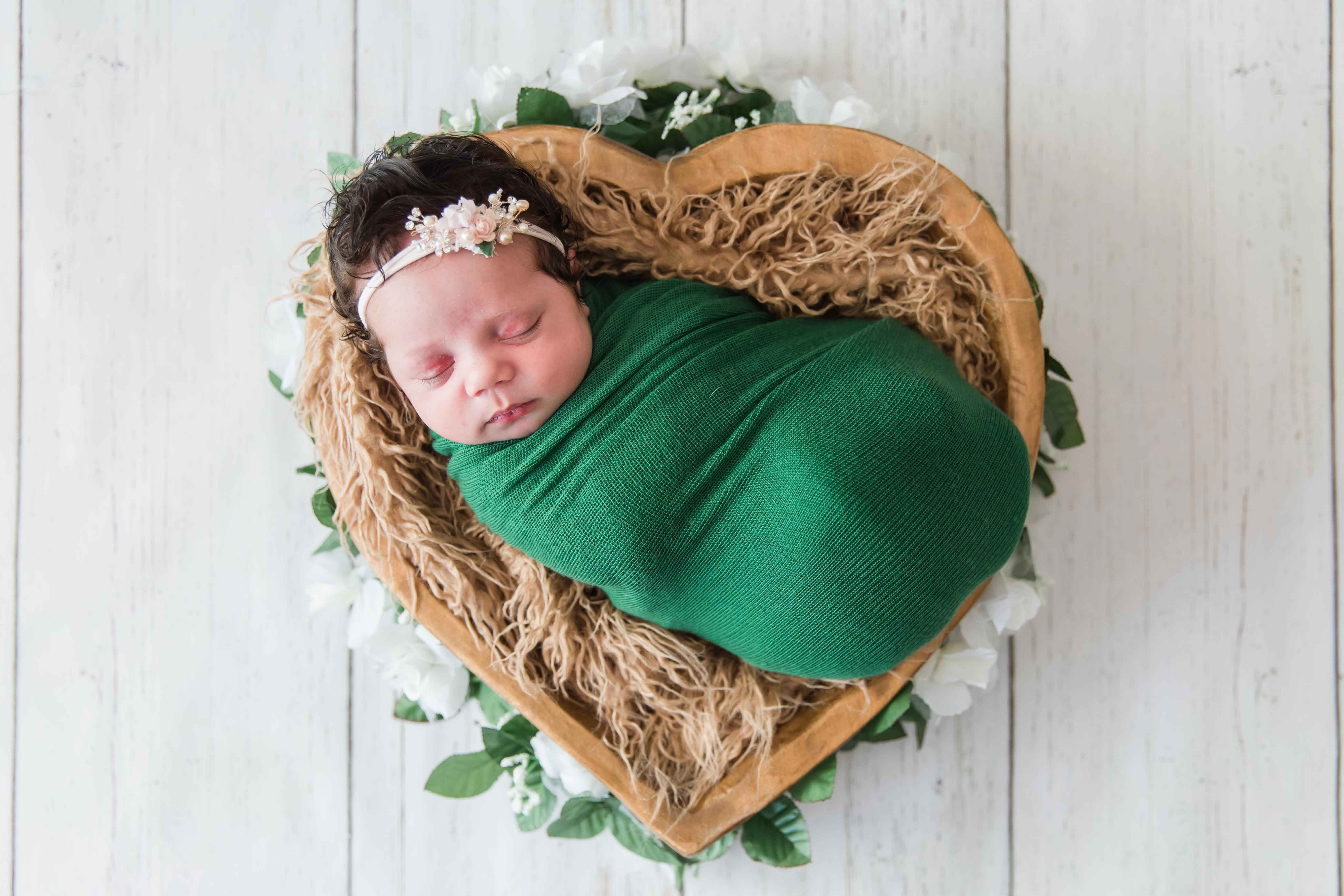 Painting of a sleeping baby wrapped in green fabric in a heart-shaped basket with flowers.