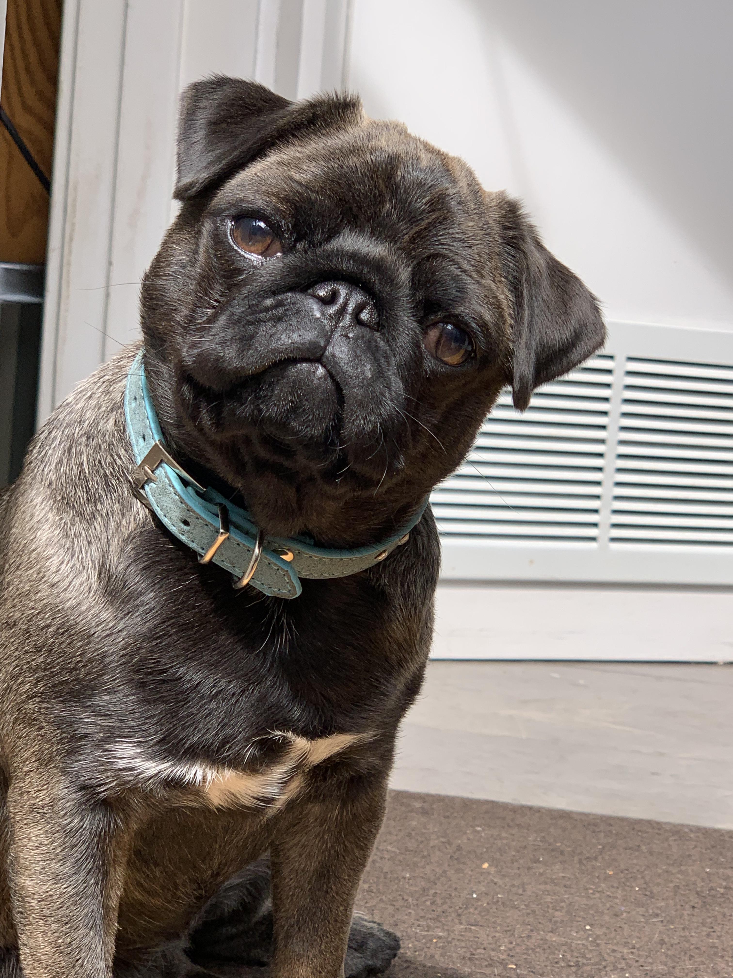 Painting of two black pugs wearing collars.