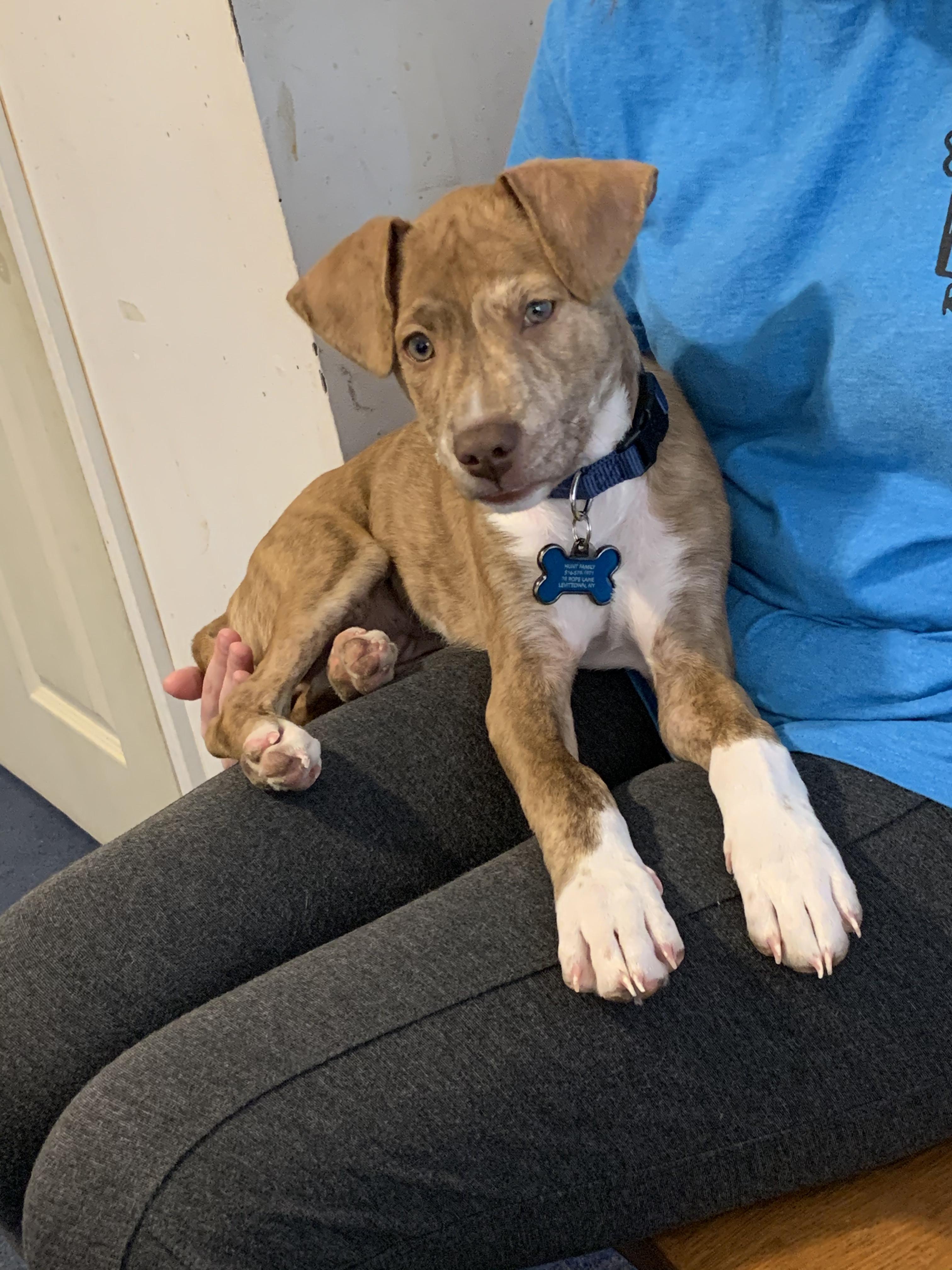 Painting of a pit bull with an orange collar looking towards a lake and trees