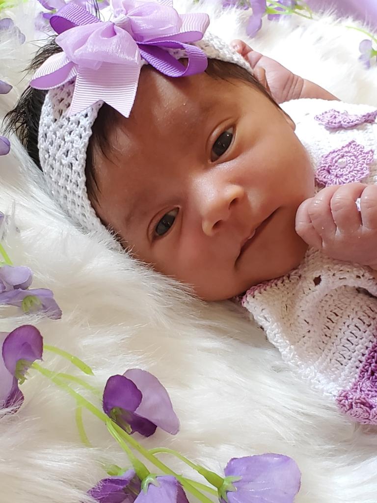 Oil painting of a baby girl wearing a purple bow and white crocheted headband.