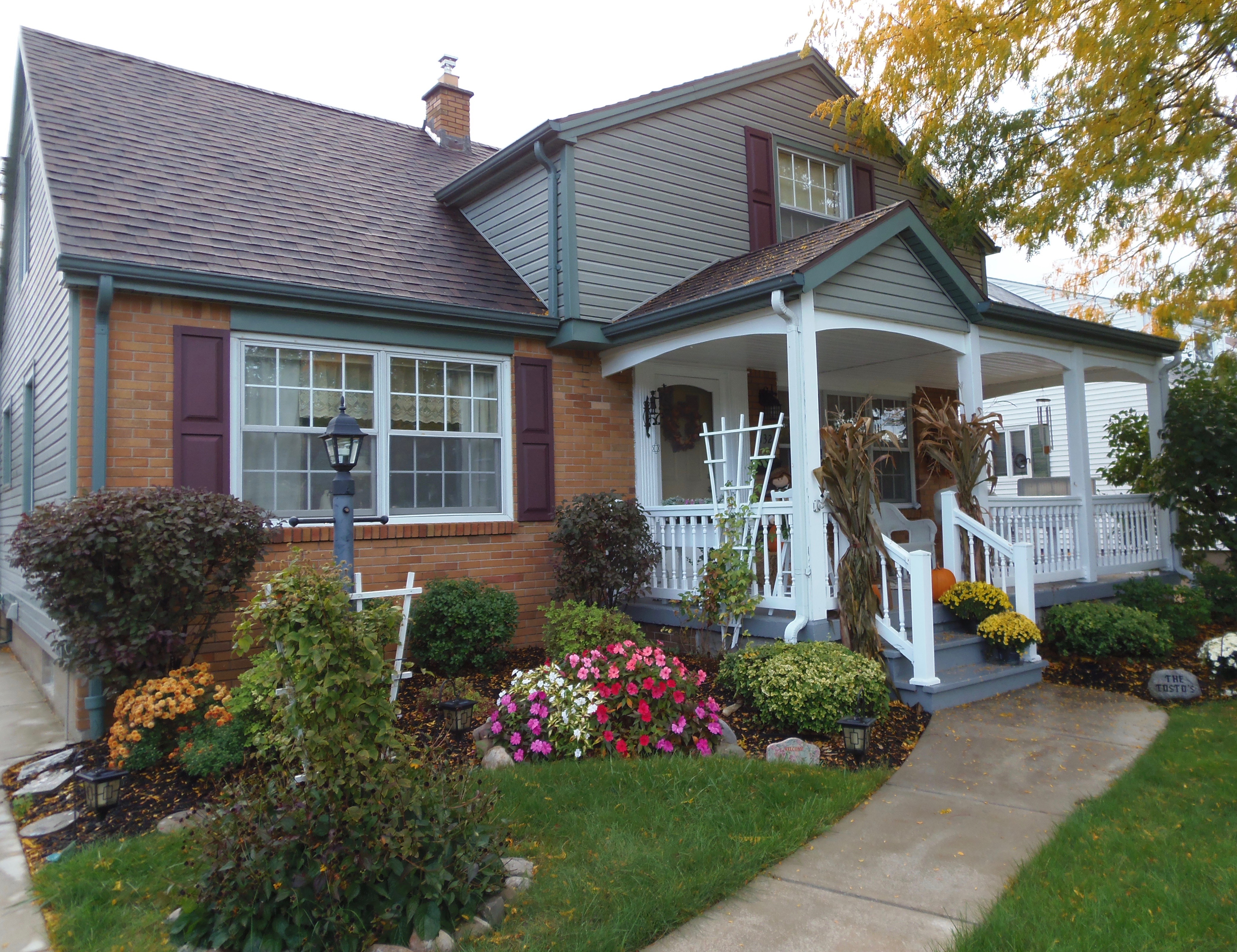 Painting of a gray and brick house with a white porch and flower garden.