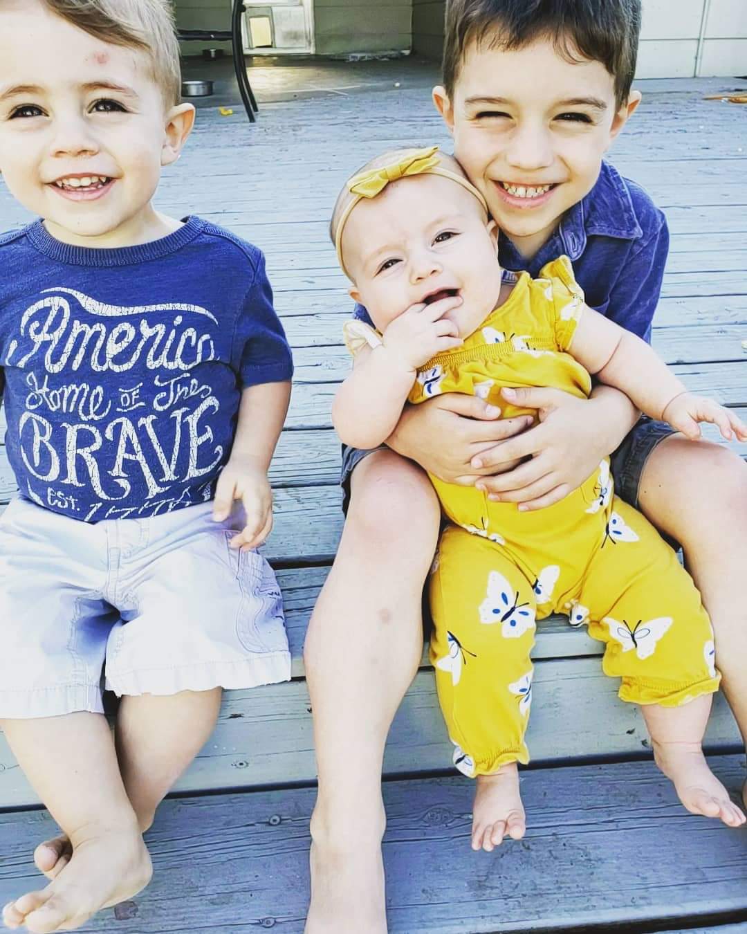 Painting of three young children sitting on steps, two boys and a baby girl.