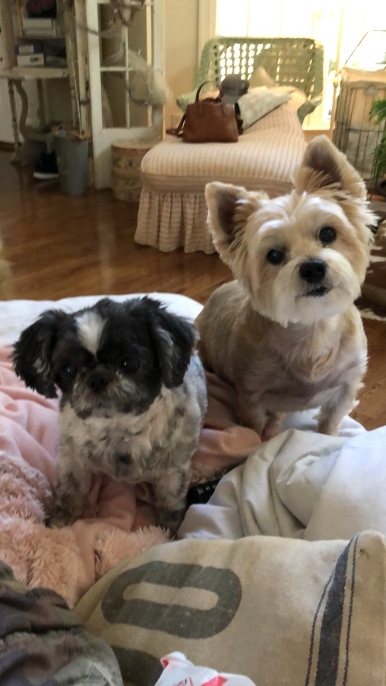 Painting of two small dogs, one black and white, the other light brown, sitting on a pink blanket.