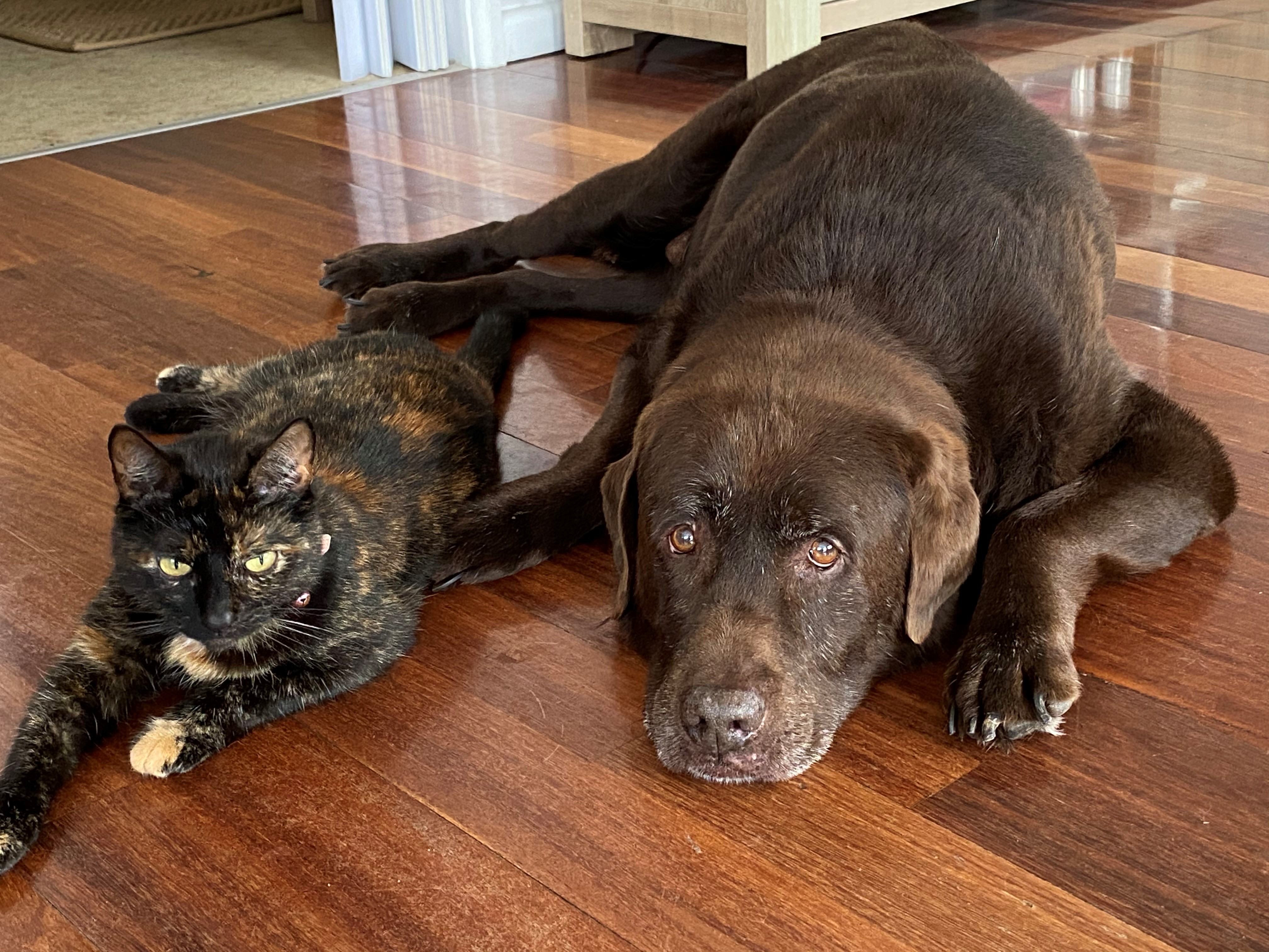 Painting of a chocolate Labrador and a tortoiseshell cat lying down.