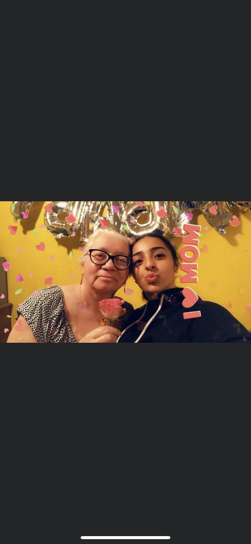 Close-up portrait of an older woman and a younger woman posing together, holding a pink rose.