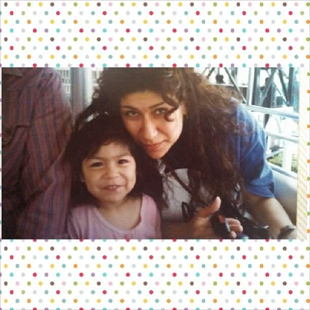 Colored pencil portrait of a smiling woman with dark hair wearing a red shirt and necklace.