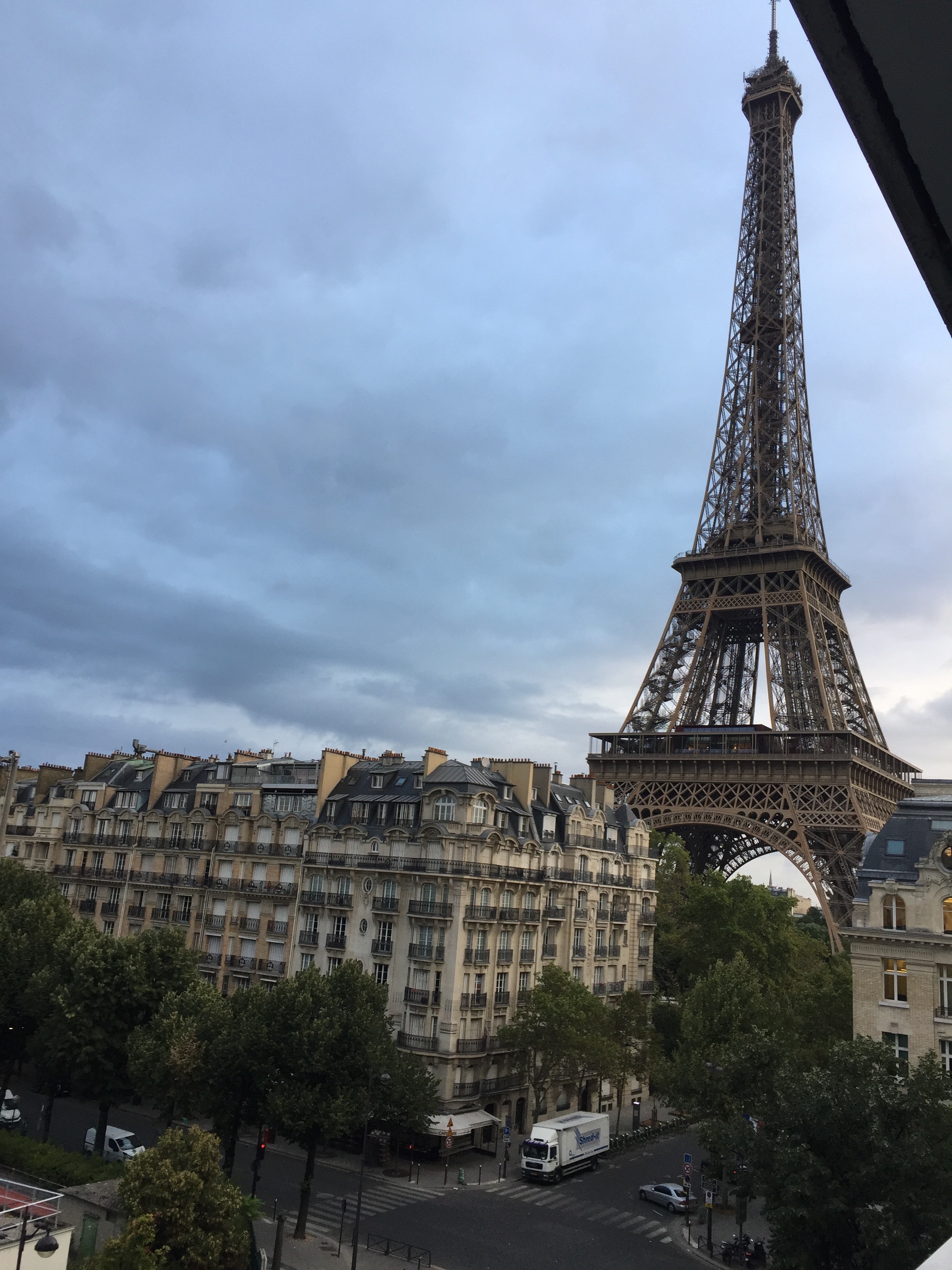 Parisian cityscape with the Eiffel Tower under a cloudy sky.