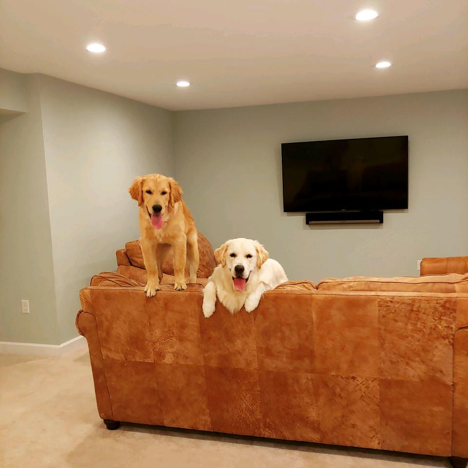 Painting of two Golden Retrievers lying in grass, one white and one golden.