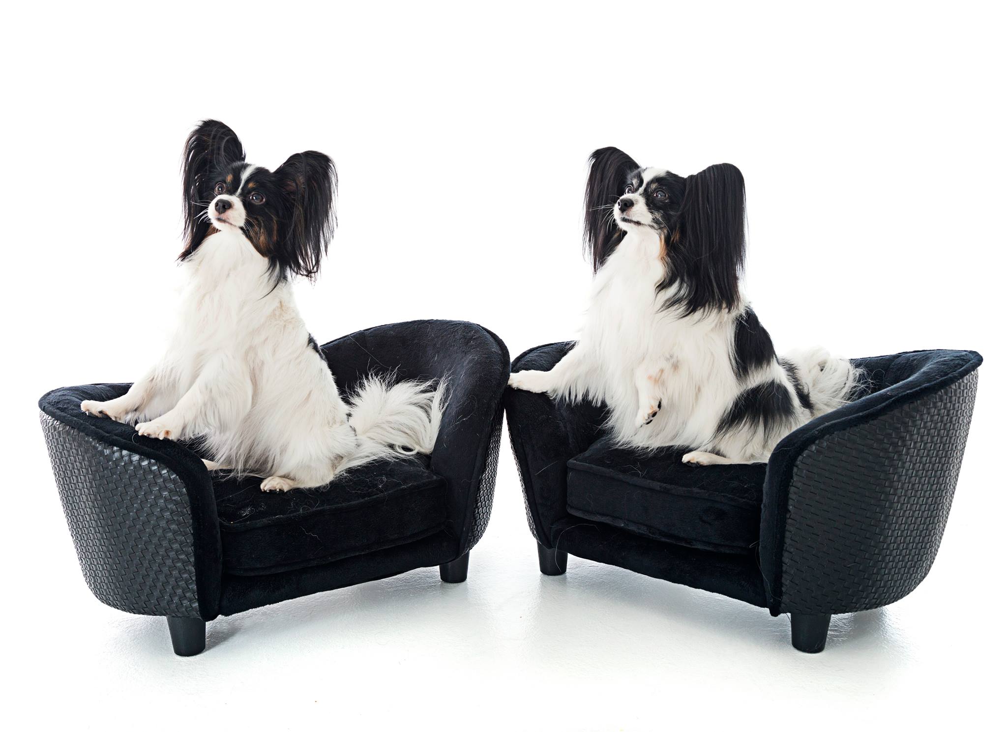 Painting of two Papillon dogs sitting on personalized miniature couches.