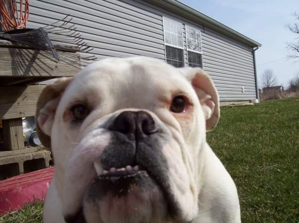 Painting of three dogs: a white bulldog, a tan bullmastiff, and a blue heeler.