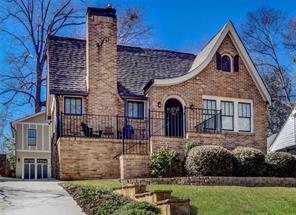 Painting of a brick house with a curved roofline, black railings, and landscaping.