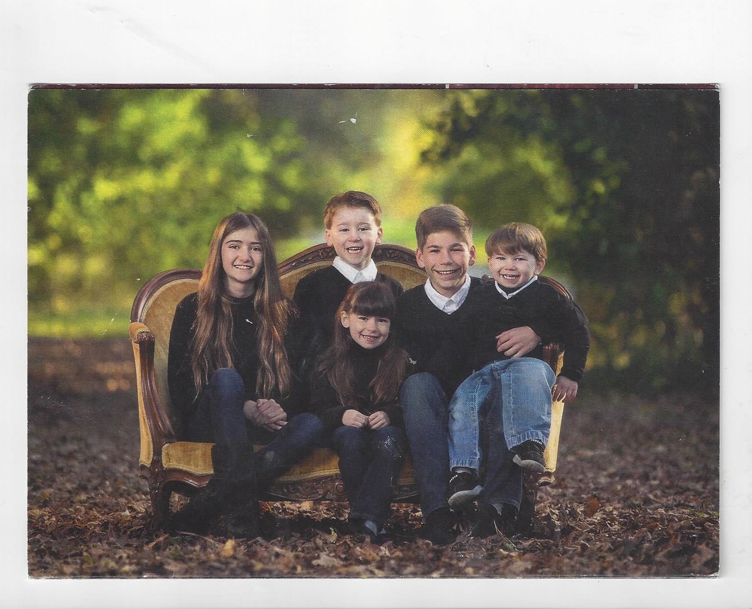 Oil painting of five siblings sitting on a couch against a green background.
