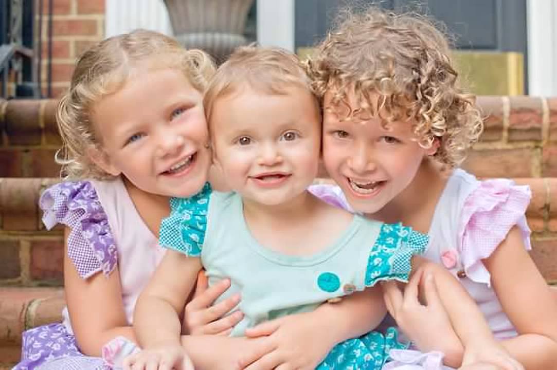 Painting of three young girls hugging, two older sisters flanking a younger sibling.
