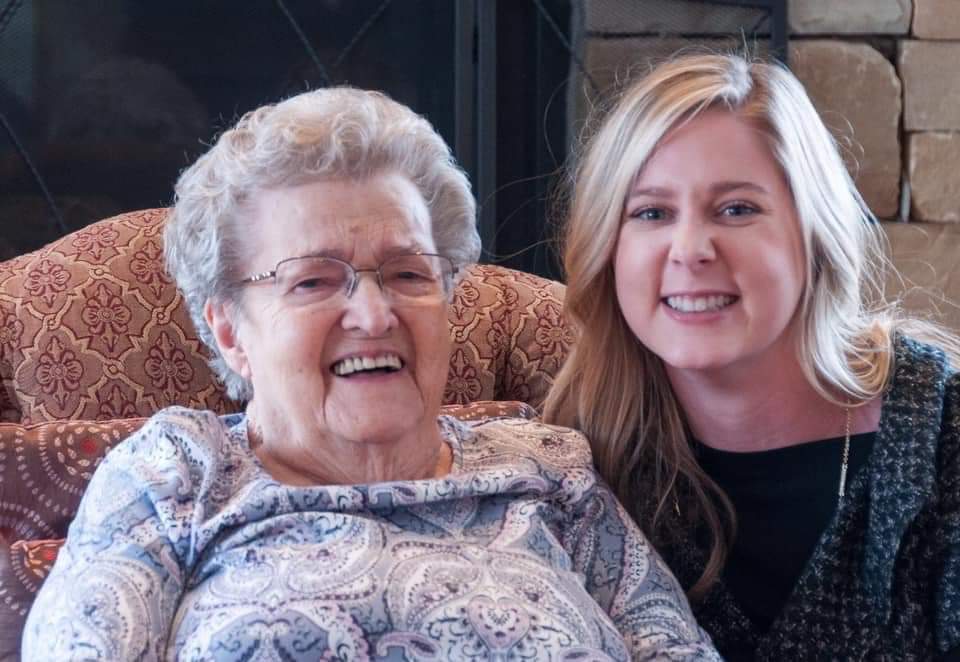 Painted portrait of an older woman with glasses laughing and a younger blonde woman smiling.