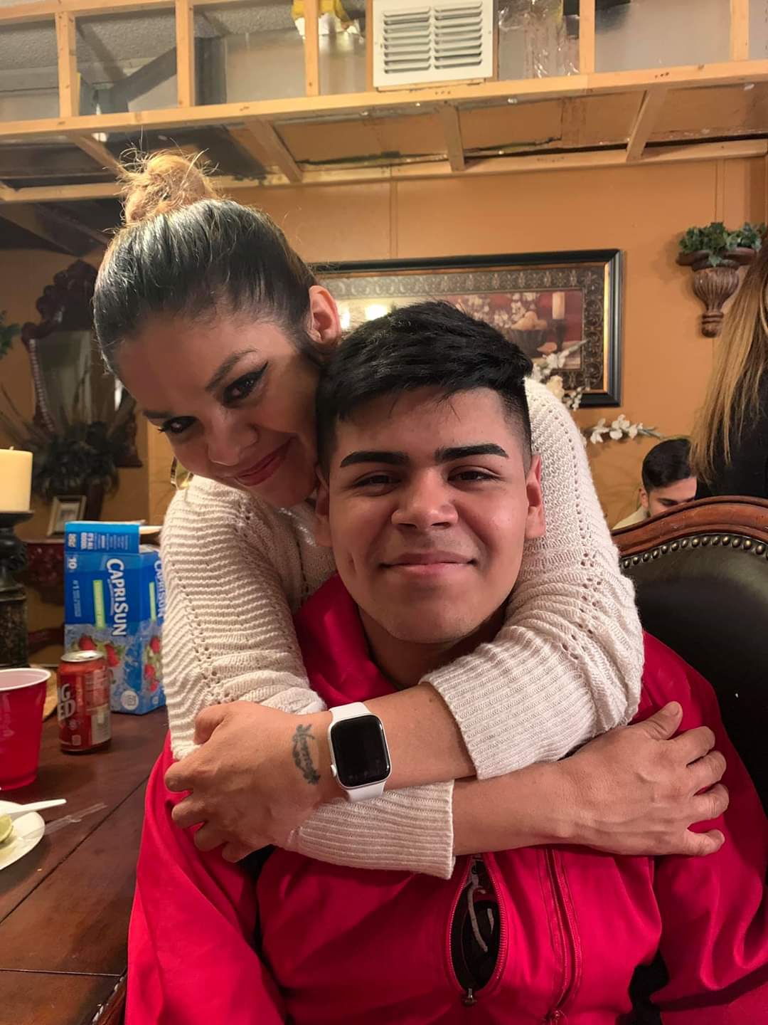 Painting of a young woman hugging an older man