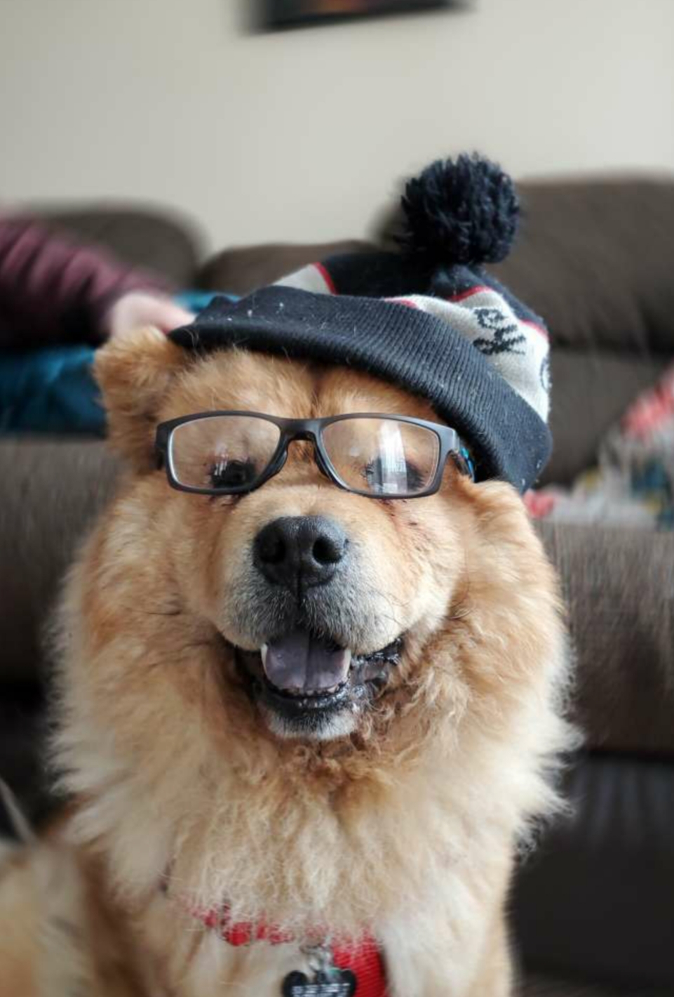 Painting of a Chow Chow dog wearing glasses and a knit hat.