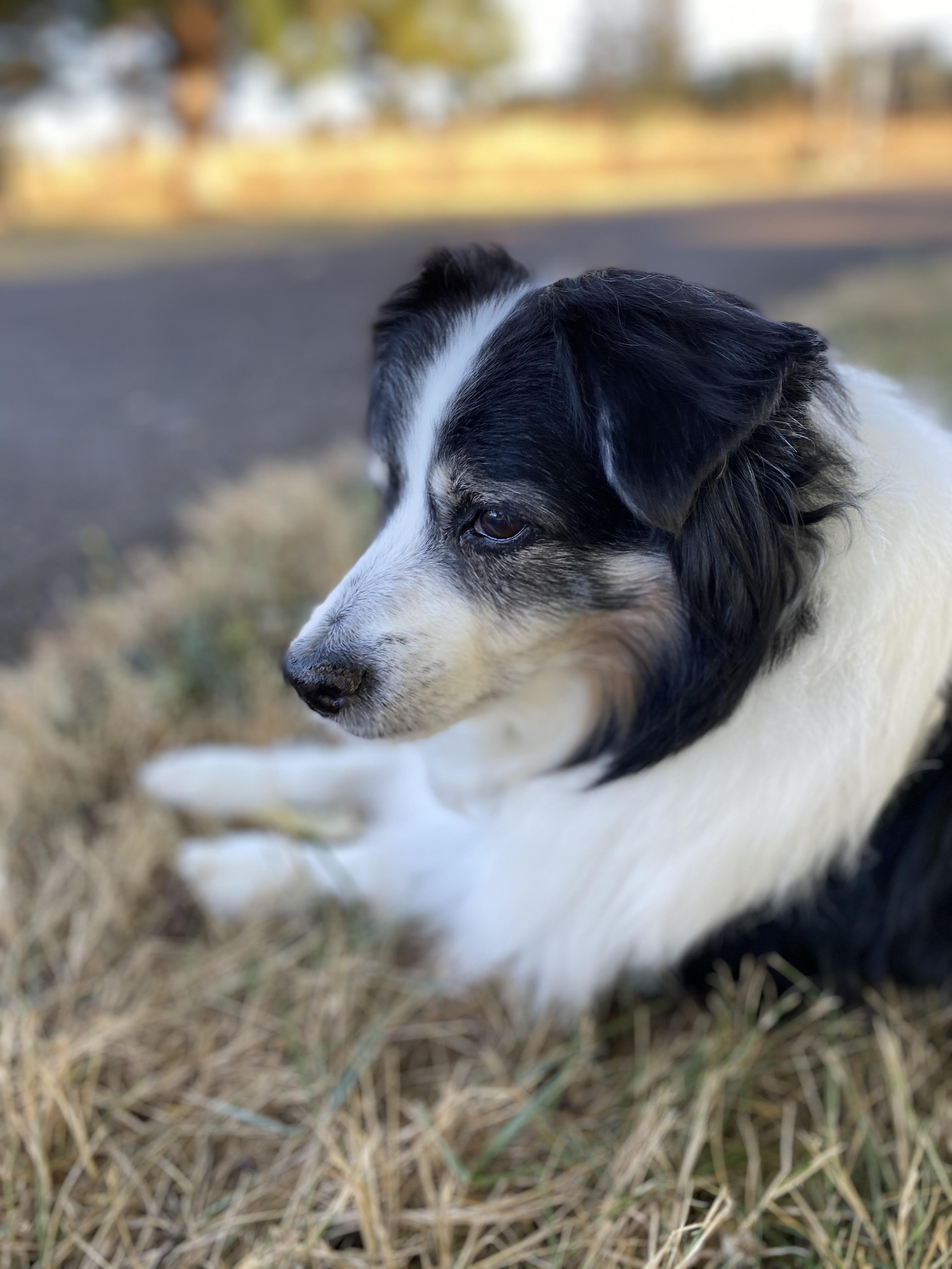 Painting of a border collie lying down, looking to the left, against a sunset background.