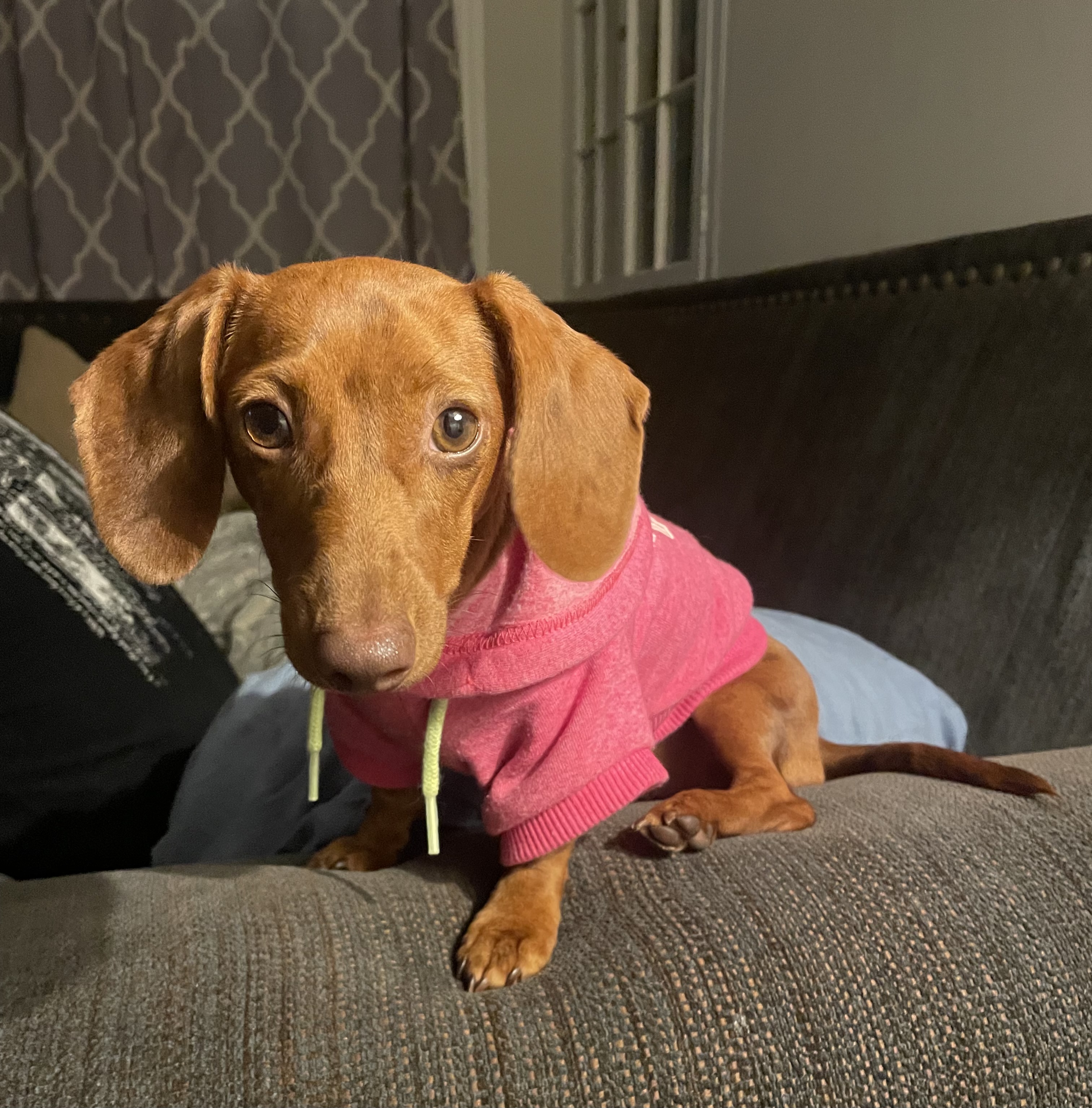 Painting of a dachshund wearing a pink hoodie
