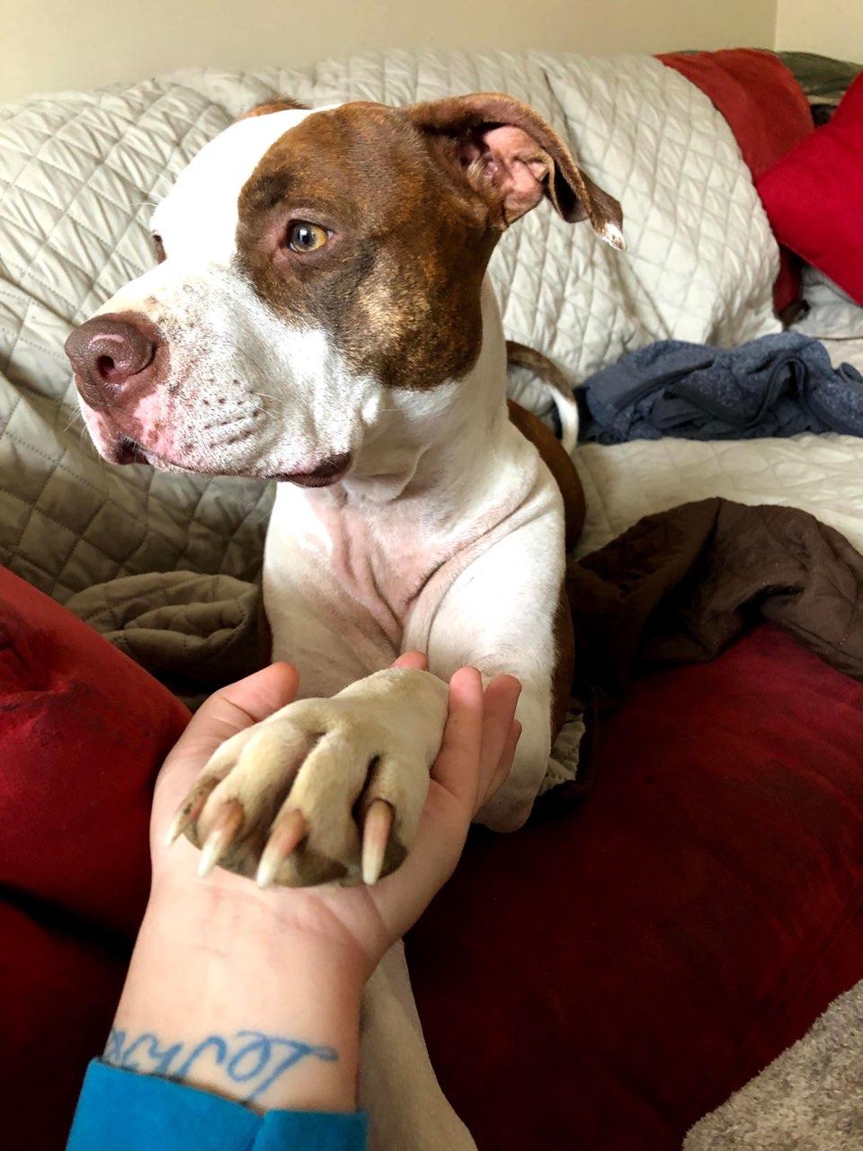 Painting of a brown and white pit bull resting its paw in a person`s hand.