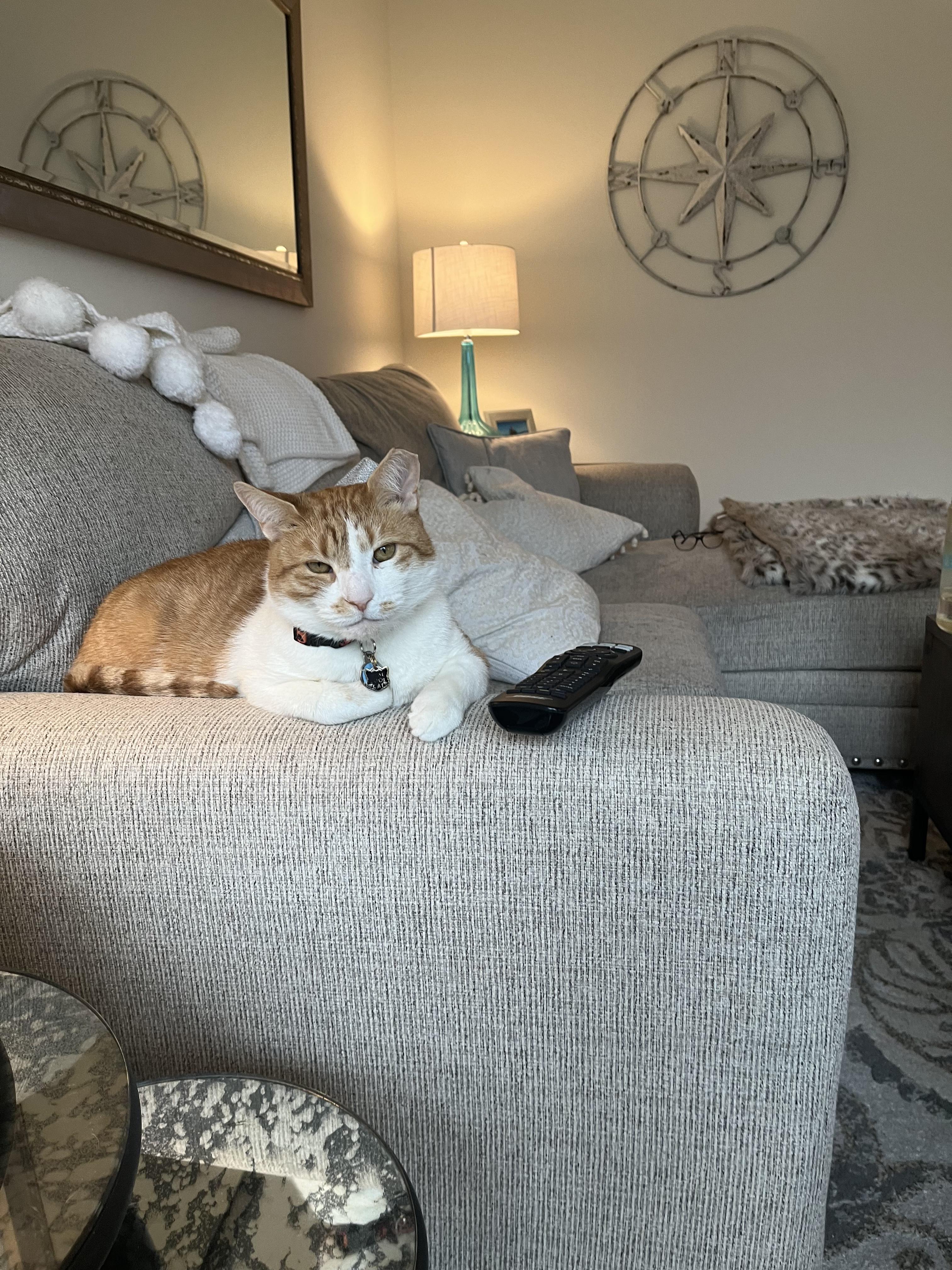 Oil painting of an orange and white cat wearing a collar with a tag.